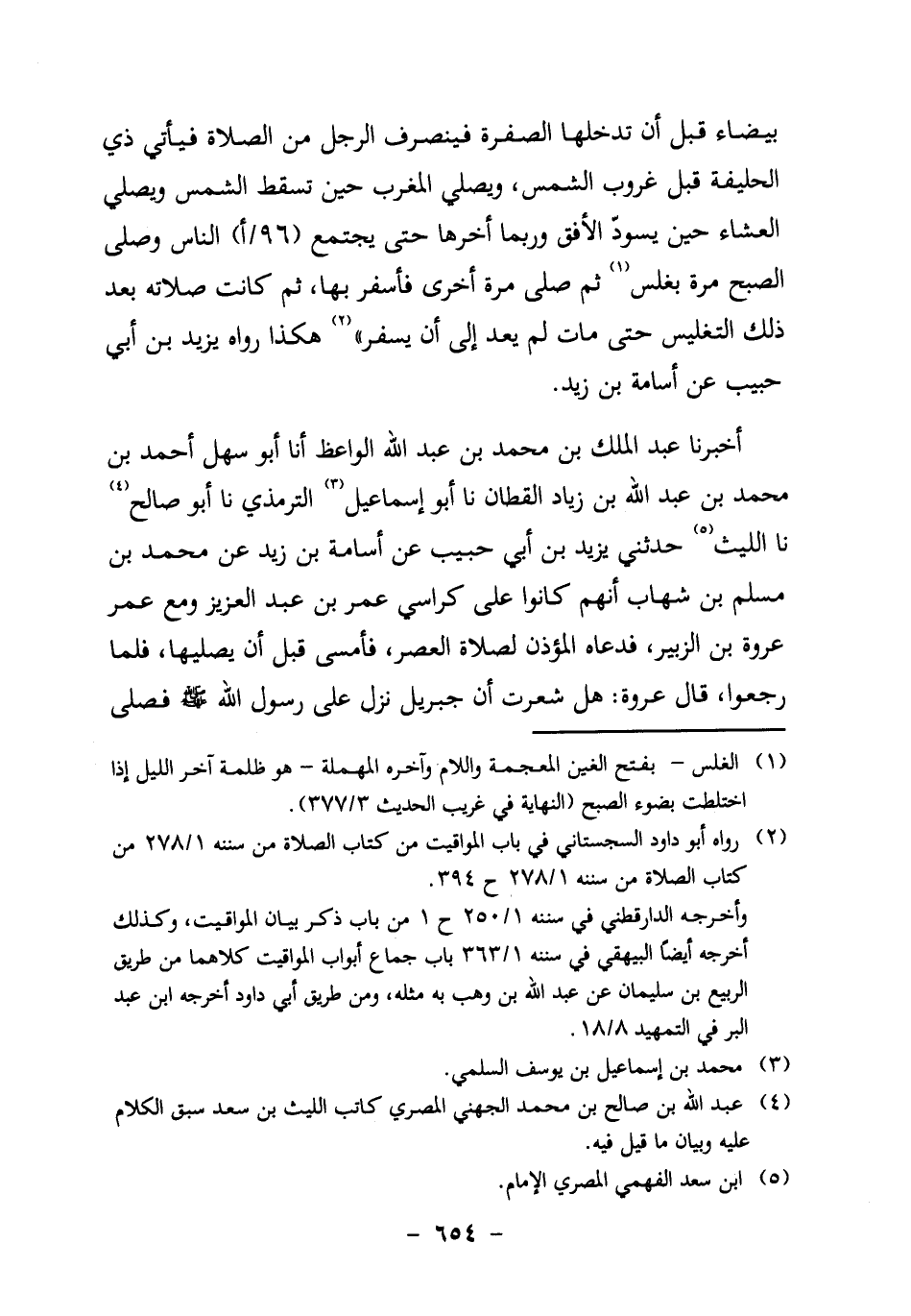 بَيْضَاءُ قَبْلَ أَنْ تَدْخُلَهَا الصُّفْرَةُ، فَيَنْصَرِفُ الرَّجُلُ مِنَ الصَّلاةِ فَيَأْتِي ذي الْحُلَيْفَةَ قَبْلَ غُرُوبِ الشَّمْسِ، وَيُصَلِّي المغرب حين تَسْقُطُ الشَّمْسُ، وَيُصَلِّي الْعِشَاءَ حِينَ يَسْوَدُّ الأُفْقُ، وَرُبَّمَا أَخَّرَهَا حَتَّى يجتمع (96/أ) النَّاسُ، وَصَلَّى الصُّبْحَ مَرَّةً بِغَلَسٍ1، ثُمَّ صَلَّى مَرَّةً أُخْرَى فَأَسْفَرَ بِهَا، ثُمَّ كَانَتْ صَلاتُهُ بَعْدَ ذَلِكَ التَّغْلِيسَ حَتَّى مَاتَ، لَمْ يعد إلى أن يسفر" 2. هكذا رَوَاهُ يَزِيدُ بْنُ أَبِي حَبِيبٍ عن أسامة بن زيد.