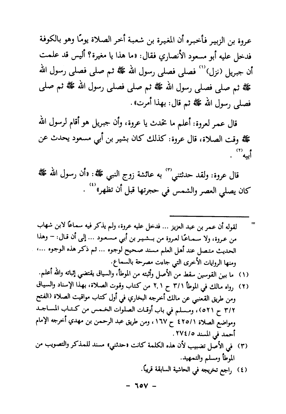 2 رواه مالك في الموطأ 1/ 3 ح 1، 2 من كتاب وقوت الصلاة بهذا الإسناد والسياق، ومن طريق القعنبي عن مالك أخرجه البخاري في أول كتاب مواقيت الصلاة (الفتح 2/ 3 ح 521) ، ومسلم في باب أوقات الصلوات الخمس من كتاب المساجد ومواضع الصلاة 1/ 425 ح 167، ومن طريق عبد الرحمن بن مهدي أخرجه الإمام أحمد في المسند 5/ 274.