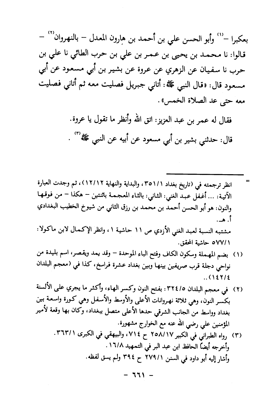 ابن حَرْبٍ الطَّائِيُّ، نا عَلِيُّ بْنُ حَرْبٍ، نا سُفْيَانُ، عَنِ الزُّهْرِيُّ، عَنْ عُرْوَةَ، عَنْ بَشِيرِ بْنِ أَبِي مَسْعُودٍ، عَنْ أَبِي مَسْعُودٍ قَالَ: "قَالَ النَّبِيُّ صَلَّى اللَّهُ عَلَيْهِ وَسَلَّمَ: أَتَانِي جِبْرِيلُ، فَصَلَّيْتُ مَعَهُ، ثُمَّ أَتَانِي، فَصَلَّيْتُ مَعَهُ حتى عد الصلاة الْخَمْسَ".