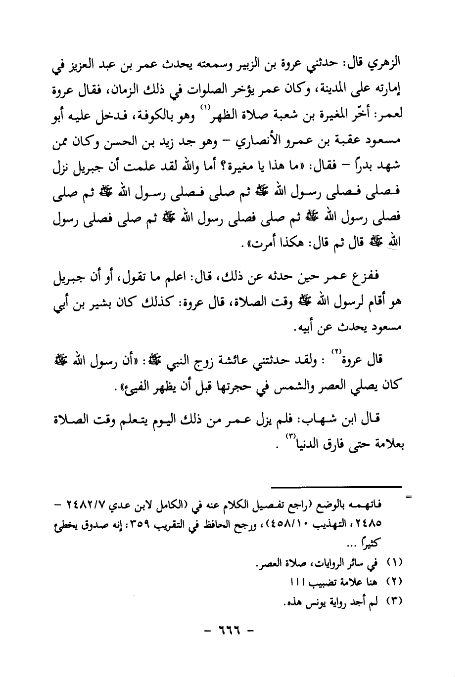 الزُّهْرِيِّ قَالَ: حَدَّثَنِي عُرْوَةُ بْنُ الزُّبَيْرِ، وَسَمِعْتُهُ يُحَدِّثُ عُمَرَ بْنَ عَبْدِ الْعَزِيزِ فِي إِمَارَتِهِ عَلَى الْمَدِينَةِ، وَكَانَ عُمَرُ يُؤَخِّرُ الصَّلَوَاتِ فِي ذَلِكَ الزَّمَانِ، فَقَالَ عُرْوَةُ لِعُمَرَ: أَخَّرَ الْمُغِيرَةُ بْنُ شُعْبَةَ صَلاةَ الظُّهْرِ1 وَهُوَ بِالْكُوفَةِ، فَدَخَلَ عَلَيْهِ أَبُو مَسْعُودٍ عُقْبَةُ بْنُ عَمْرٍو الأَنْصَارِيُّ ـ وَهُوَ جَدُّ زَيْدِ بن الحسن، وَكَانَ مِمَّنْ شَهِدَ بَدْرًا ـ فَقَالَ: "مَا هَذَا يَا مُغِيرَةُ؟ أَمَا وَاللَّهِ، لَقَدْ عَلِمْتَ أَنَّ جِبْرِيلَ نَزَلَ فَصَلَّى، فَصَلَّى رَسُولُ اللَّهِ صَلَّى اللَّهُ عَلَيْهِ وَسَلَّمَ، ثُمَّ صَلَّى فَصَلَّى رَسُولُ اللَّهِ صَلَّى اللَّهُ عَلَيْهِ وَسَلَّمَ، ثُمَّ صَلَّى فَصَلَّى رَسُولُ اللَّهِ صَلَّى اللَّهُ عَلَيْهِ وَسَلَّمَ، ثُمَّ صَلَّى فَصَلَّى رسول الله صَلَّى اللَّهُ عَلَيْهِ وَسَلَّمَ، ثُمَّ صَلَّى فَصَلَّى رَسُولُ الله صَلَّى اللَّهُ عَلَيْهِ وَسَلَّمَ، قال: ثُمَّ قَالَ: هَكَذَا أُمِرْتُ".