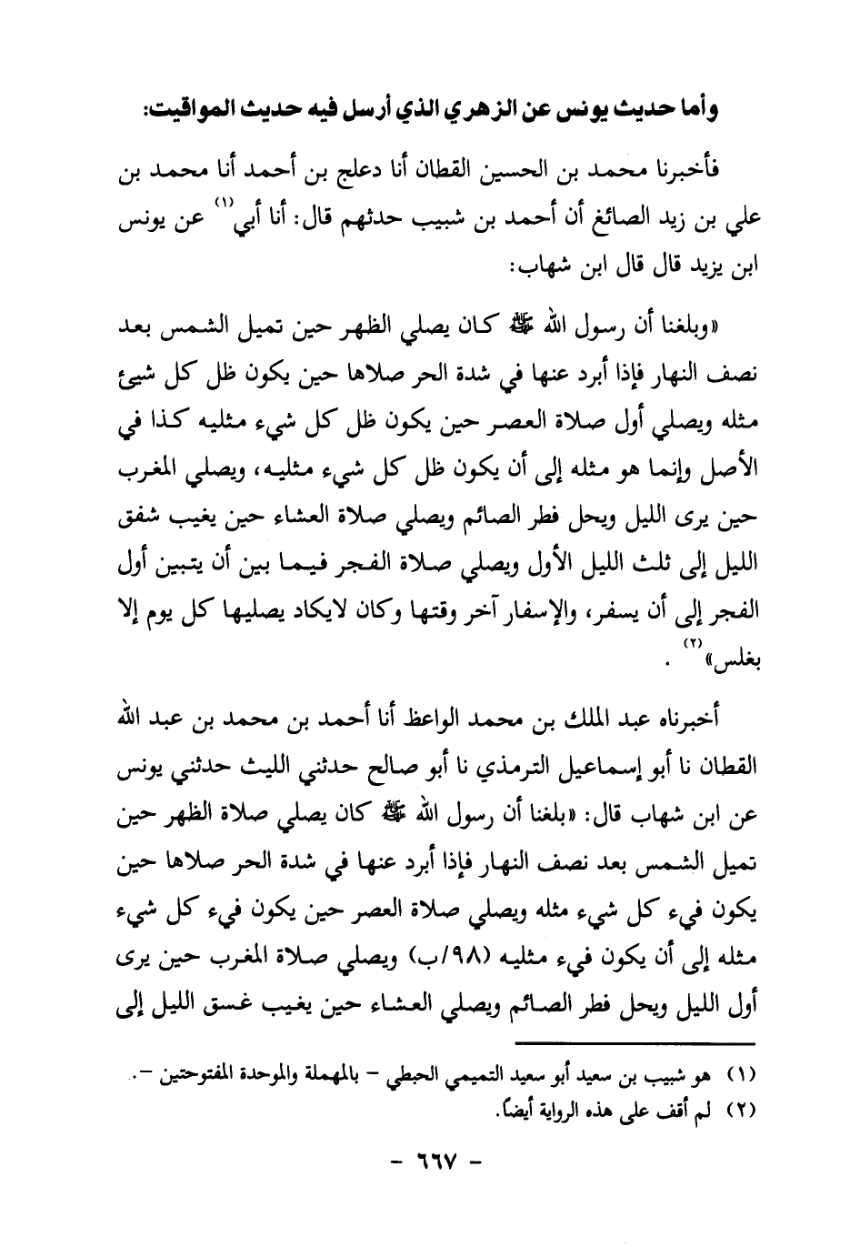 أخبرناه عَبْدُ الْمَلِكِ بْنُ مُحَمَّدٍ الْوَاعِظُ، أنا أَحْمَدُ بْنُ مُحَمَّدِ بْنِ عَبْدِ اللَّهِ الْقَطَّانُ، نا أَبُو إِسْمَاعِيلَ التِّرْمِذِيُّ، نَا أَبُو صَالِحٍ، حَدَّثَنِي اللَّيْثُ، حَدَّثَنِي يُونُسُ عَنِ ابْنِ شِهَابٍ، قَالَ: "بَلَغَنَا أَنَّ رسول الله صَلَّى اللَّهُ عَلَيْهِ وَسَلَّمَ كَانَ يُصَلِّي صَلاةَ الظُّهْرِ حِينَ تَمِيلُ الشَّمْسُ بَعْدَ نِصْفِ النَّهَارِ، فَإِذَا أَبْرَدَ عَنْهَا فِي شِدَّةِ الْحَرِّ صَلاهَا حِينَ يَكُونُ فَيْءُ كُلِّ شَيْءٍ مِثْلَهُ، وَيُصَلِّي صَلاةَ الْعَصْرِ حِينَ يَكُونُ فَيْءُ كُلِّ شَيْءٍ مِثْلَهُ إِلَى أَنْ يكون فيء مثليه (98/ب) ، وَيُصَلِّي صَلاةَ الْمَغْرِبِ حِينَ يَرَى أَوَّلَ اللَّيْلِ وَيَحِلُّ فِطْرُ الصَّائِمِ، وَيُصَلِّي الْعِشَاءَ حِينَ يَغِيبُ غَسَقُ الليل
