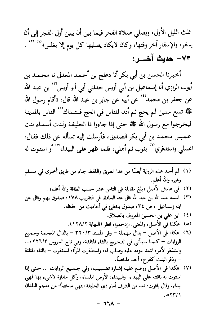 أَخْبَرَنَا الْحَسَنُ بْنُ أَبِي بَكْرٍ، أنا دَعْلَجُ بْنُ أَحْمَدَ الْمُعَدَّلُ، نا مُحَمَّدُ بْنُ أَيُّوبَ الرَّازِي، أنا إِسْمَاعِيلُ بْنُ أَبِي أُوَيْسٍ، حَدَّثَنِي أَبِي أَبُو أُوَيْسِ3 بْنُ عَبْدِ اللَّهِ عَنْ جَعْفَرِ بْنِ مُحَمَّدٍ4، عَنْ أَبِيهِ، عَنْ جَابِرِ بْنِ عَبْدِ اللَّهِ قَالَ: "أَقَامَ رَسُولُ اللَّهِ صَلَّى اللَّهُ عَلَيْهِ وَسَلَّمَ تِسْعَ سِنِينَ لَمْ يَحُجَّ، ثُمَّ أَذِنَ لِلنَّاسِ في الحج فتداك5 الناس بالمدينة لِيَخْرُجُوا مَعَ رَسُولِ اللَّهِ صَلَّى اللَّهُ عَلَيْهِ وَسَلَّمَ حَتَّى إِذَا جاؤوا ذَا الْحُلَيْفَةِ وَلَدَتْ أَسْمَاءُ بِنْتُ عُمَيْسٍ مُحَمَّدَ بْنَ أَبِي بَكْرٍ الصِّدِّيقِ، فَأَرْسَلَتْ إِلَيْهِ تَسْأَلُهُ عَنْ ذلك، فقال: اغسلي واستدفري6 بِثَوْبٍ ثُمَّ أَهِلِّي، فَلَمَّا ظَهَرَ عَلَى الْبَيْدَاءِ7 أَوِ اسْتَوَتْ لَهُ