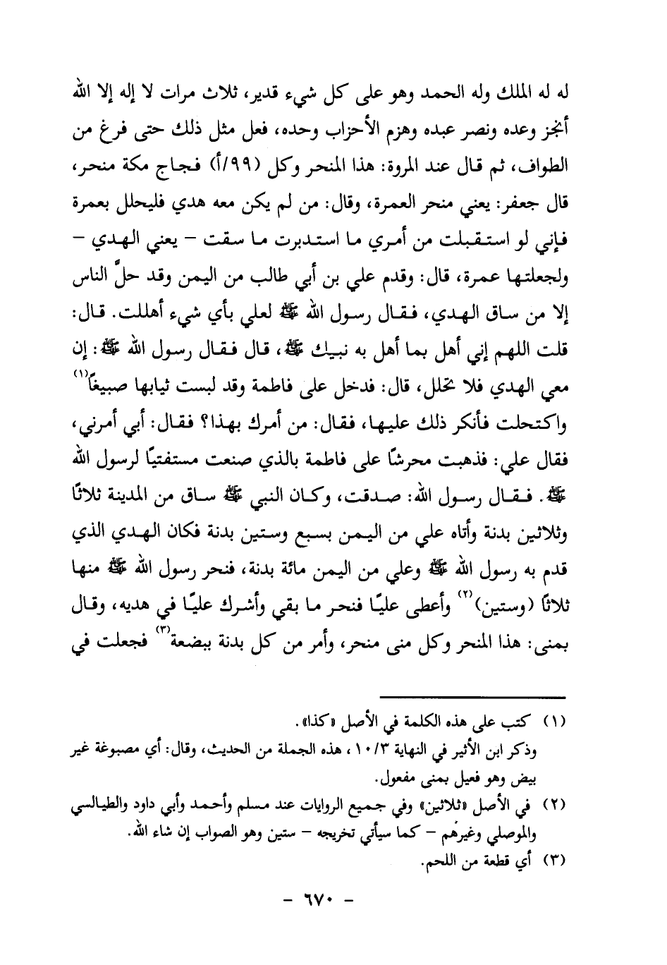 لَهُ، لَهُ الْمُلْكُ وَلَهُ الْحَمْدُ، وَهُوَ عَلَى كُلِّ شَيْءٍ قَدِيرٌ ـ ثَلاثَ مَرَّاتٍ ـ لا إِلَهَ إِلا اللَّهُ، أَنْجَزَ وَعْدَهُ، وَنَصَرَ عَبْدَهُ، وهزم الأحزاب وحده" فعل ذَلِكَ حَتَّى فَرَغَ مِنَ الطَّوَافِ، ثُمَّ قَالَ عِنْدَ الْمَرْوَةِ: هَذَا المنحر وكل (99/أ) فَجَاجِ مَكَّةَ مَنْحَرٌ، قَالَ جَعْفَرٌ: يَعْنِي مَنْحَرَ الْعُمْرَةِ، وَقَالَ: مَنْ لَمْ يَكُنْ مَعَهُ هَدْيٌ فَلْيُحْلِلْ بِعُمْرَةٍ، فَإِنِّي لَوِ اسْتَقْبَلْتُ مِنْ أَمْرِي مَا اسْتَدْبَرْتُ مَا سُقْتُ ـ يَعْنِي الْهَدْيَ ـ وَلَجَعَلْتُهَا عُمْرَةً، قَالَ: وَقَدِمَ عَلِيُّ بْنُ أَبِي طَالِبٍ مِنَ الْيَمَنِ، وَقَدْ حَلَّ النَّاسُ إِلا مَنْ سَاقَ الْهَدْيَ، فَقَالَ رسول الله صَلَّى اللَّهُ عَلَيْهِ وَسَلَّمَ لِعَلِيٍّ: بِأَيِّ شَيْءٍ أَهْلَلْتَ؟ قَالَ: قُلْتُ: اللَّهُمَّ إِنِّي أُهِلُّ بِمَا أَهَلَّ بِهِ نَبِيُّكَ صَلَّى اللَّهُ عَلَيْهِ وَسَلَّمَ، قَالَ: فَقَالَ رسول الله صَلَّى اللَّهُ عَلَيْهِ وَسَلَّمَ: إِنَّ مَعِي الْهَدْيَ فَلا تَحْلُلْ، قَالَ: فَدَخَلَ عَلَى فَاطِمَةَ، وَقَدْ لَبِسَتْ ثِيَابَهَا صَبِيغًا1 وَاكْتَحَلَتْ، فأنكر ذلك عليها، فَقَالَ: مَنْ أَمَرَكِ بِهَذَا؟ فَقَالَتْ: أَبِي أَمَرَنِي، فَقَالَ عَلِيٌّ: فَذَهَبْتُ مُحَرِّشًا عَلَى فَاطِمَةَ بِالَّذِي صَنَعَتْ مُسْتَفْتِيًا لِرَسُولِ اللَّهِ صَلَّى اللَّهُ عَلَيْهِ وَسَلَّمَ، فَقَالَ رَسُولُ اللَّهِ: صَدَقْتَ، وَكَانَ النَّبِيُّ صَلَّى اللَّهُ عَلَيْهِ وَسَلَّمَ سَاقَ مِنَ الْمَدِينَةِ ثَلاثًا وَثَلاثِينَ بَدَنَةً، وَأَتَاهُ عَلِيٌّ مِنَ الْيَمَنِ بِسَبْعٍ وَسِتِّينَ بَدَنَةً، فَكَانَ الْهَدْيُ الَّذِي قَدِمَ بِهِ رسول الله صَلَّى اللَّهُ عَلَيْهِ وَسَلَّمَ وَعَلِيٌّ مِنَ الْيَمَنِ مِائَةَ بَدَنَةٍ، فَنَحَرَ رَسُولُ اللَّهِ صَلَّى اللَّهُ عَلَيْهِ وَسَلَّمَ مِنْهَا ثَلاثًا (وستين) 2 وَأَعْطَى عَلِيًّا فَنَحَرَ مَا بَقِيَ وَأَشْرَكَ عَلِيًّا فِي هَدْيِهِ، وَقَالَ بِمِنًى: هَذَا الْمَنْحَرُ وَكُلُّ مِنًى مَنْحَرٌ، وَأَمَرَ مِنْ كُلِّ بَدَنَةٍ ببضعة3، فجعلت في