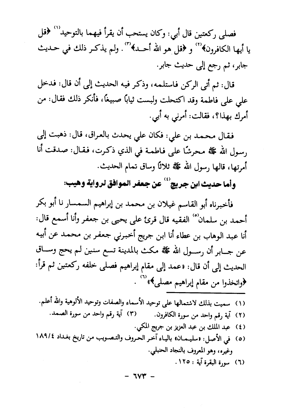 فَصَلَّى رَكْعَتَيْنِ، قَالَ أَبِي: وَكَانَ يَسْتَحِبُّ أَنْ يَقْرَأَ فِيهِمَا بِالتَّوْحِيدِ1: {قُلْ يَا أَيُّهَا الْكَافِرُونَ} 2، وَ {قُلْ هُوَ اللَّهُ أَحَدٌ} 3. ولم يَذْكُرْ ذَلِكَ فِي حَدِيثِ جَابِرٍ، ثُمَّ رَجَعَ إِلَى حَدِيثِ جَابِرٍ.