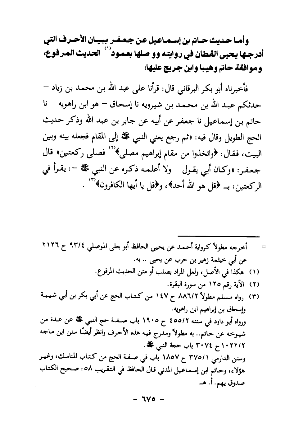 نَا إِسْحَاقُ ـ هُوَ ابْنُ رَاهَوَيْهِ ـ نا حَاتِمُ بْنُ إِسْمَاعِيلَ، نا جَعْفَرٌ، عَنْ أَبِيهِ، عَنْ جَابِرِ بْنِ عَبْدِ اللَّهِ، وَذَكَرَ حَدِيثَ الْحَجِّ الطَّوِيلِ، وَقَالَ فِيهِ: "ثُمَّ رَجَعَ ـ يَعْنِي النَّبِيَّ صَلَّى اللَّهُ عَلَيْهِ وَسَلَّمَ ـ إلى المقام فجعله بَيْنَهُ وَبَيْنَ الْبَيْتِ فَقَالَ: {وَاتَّخِذُوا مِنْ مَقَامِ إِبْرَاهِيمَ مُصَلّىً} 2 فَصَلَّى رَكْعَتَيْنِ"، قَالَ جَعْفَرٌ: "وَكَانَ أبي يقول ـ ولا أعلمه ذكره