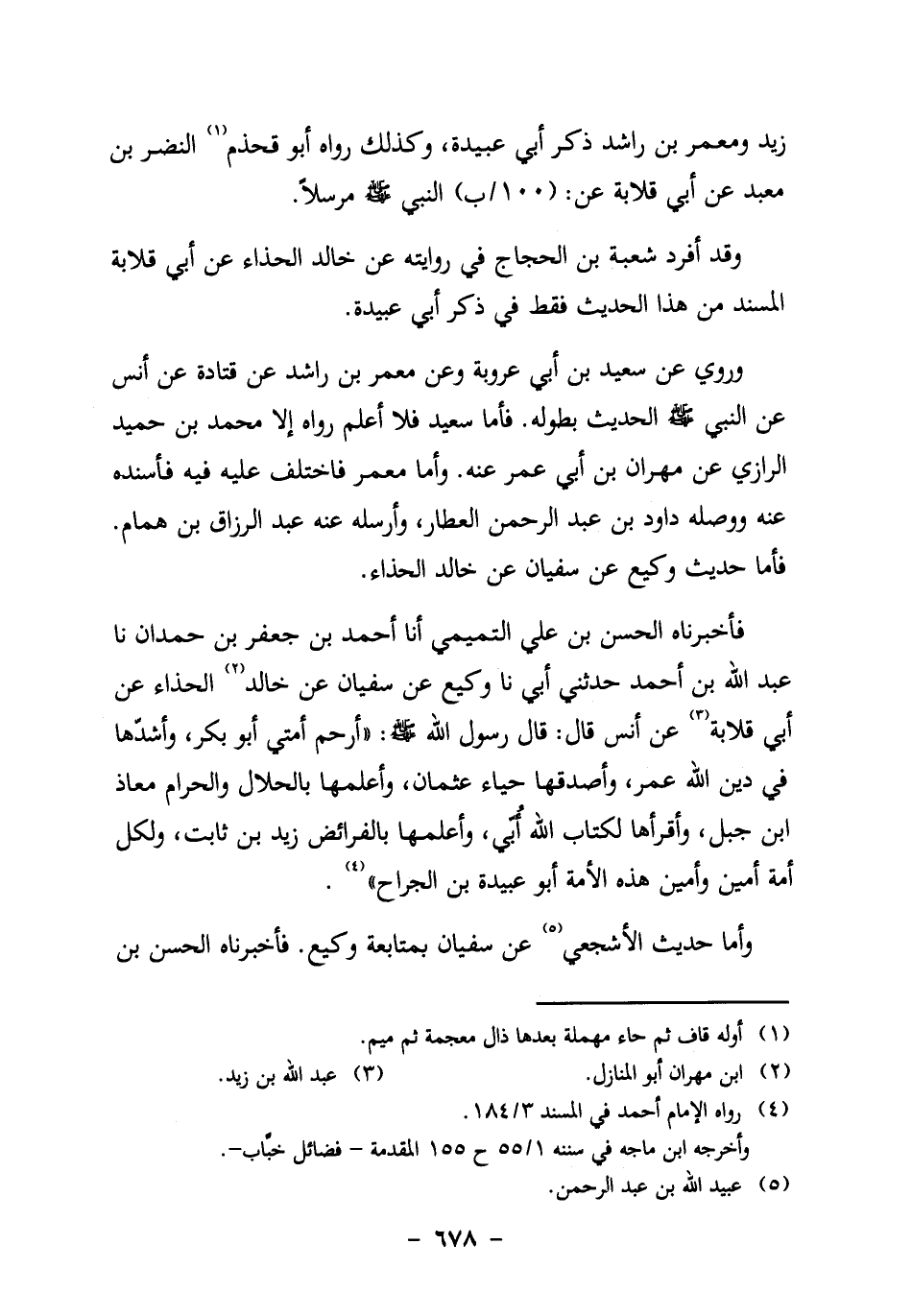 فأخبرناه الْحَسَنُ بْنُ عَلِيٍّ التَّمِيمِيُّ، أنا أَحْمَدُ بْنُ جَعْفَرِ بْنِ حَمْدَانَ، نا عَبْدُ اللَّهِ بْنُ أَحْمَدَ، حَدَّثَنِي أَبِي، نا وَكِيعٌ عَنْ سُفْيَانَ، عَنْ خَالِدٍ2 الْحَذَّاءِ، عَنْ أَبِي قِلابَةَ3، عَنْ أَنَسٍ قَالَ: قَالَ رَسُولُ اللَّهِ صَلَّى اللَّهُ عَلَيْهِ وَسَلَّمَ: "أَرْحَمُ أُمَّتِي أَبُو بَكْرٍ، وَأَشَدُّهَا فِي دِينِ اللَّهِ عُمَرُ، وَأَصْدَقُهَا حَيَاءً عُثْمَانُ، وَأَعْلَمُهَا بِالْحَلالِ وَالْحَرَامِ مُعَاذُ بْنُ جَبَلٍ، وأقرأها لكتاب الله أُبيّ، وأعلمها بالفرائض زَيْدُ بْنُ ثَابِتٍ، وَلِكُلِّ أُمَّةٍ أَمِينٌ، وَأَمِينُ هَذِهِ الأُمَّةِ أَبُو عُبَيْدَةَ بْنُ الْجَرَّاحِ" 4.