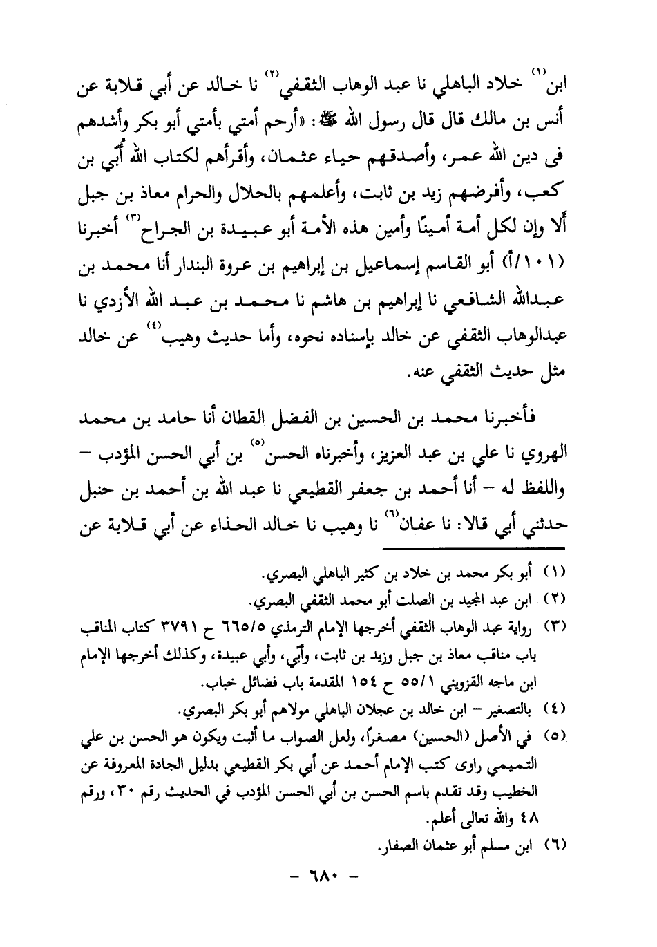 ابن1 خَلادٍ الْبَاهِلِيُّ، نا عَبْدُ الْوَهَّابِ الثَّقَفِيُّ2، نا خَالِدٌ عَنْ أَبِي قِلابَةَ، عَنْ أَنَسِ بْنِ مَالِكٍ قَالَ: قَالَ رَسُولُ اللَّهِ صَلَّى اللَّهُ عَلَيْهِ وَسَلَّمَ: " أَرْحَمُ أُمَّتِي بِأُمَّتِي أَبُو بَكْرٍ، وَأَشَدُّهُمْ فِي دِينِ اللَّهِ عُمَرُ، وَأَصْدَقُهُمْ حَيَاءً عثمان، وأقرأهم لكتاب الله أُبيّ ابن كَعْبٍ، وَأَفْرَضُهُمْ زَيْدُ بْنُ ثَابِتٍ، وَأَعْلَمُهُمْ بِالْحَلالِ وَالْحَرَامِ مُعَاذُ بْنُ جَبَلٍ، أَلا، وَإِنَّ لِكُلِّ أُمَّةٍ أَمِينًا، وَأَمِينُ هَذِهِ الأُمَّةِ أَبُو عبيدة بن الجراح" 3.