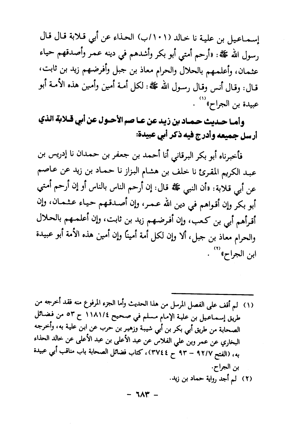نا حَمَّادُ بْنُ زَيْدٍ عَنْ عَاصِمٍ، عَنْ أَبِي قِلابَةَ: "أَنَّ النبي صَلَّى اللَّهُ عَلَيْهِ وَسَلَّمَ قال: إن أَرْحَمُ النَّاسِ بِالنَّاسِ أَوْ إِنَّ أَرْحَمَ أُمَّتِي أَبُو بَكْرٍ، وَإِنَّ أَقْوَاهُمْ فِي دِينِ اللَّهِ عُمَرُ، وَإِنَّ أَصْدَقَهُمْ حَيَاءً عُثْمَانُ، وَإِنَّ أَقْرَأَهُمْ أُبيّ بْنُ كَعْبٍ، وَإِنَّ أفرضهم زيد ابن ثَابِتٍ، وَإِنَّ أَعْلَمَهُمْ بِالْحَلالِ وَالْحَرَامِ مُعَاذُ بْنُ جَبَلٍ، أَلا وَإِنَّ لِكُلِّ أُمَّةٍ أَمِينًا، وَإِنَّ أَمِينَ هذه الأمة أبو عبيدة