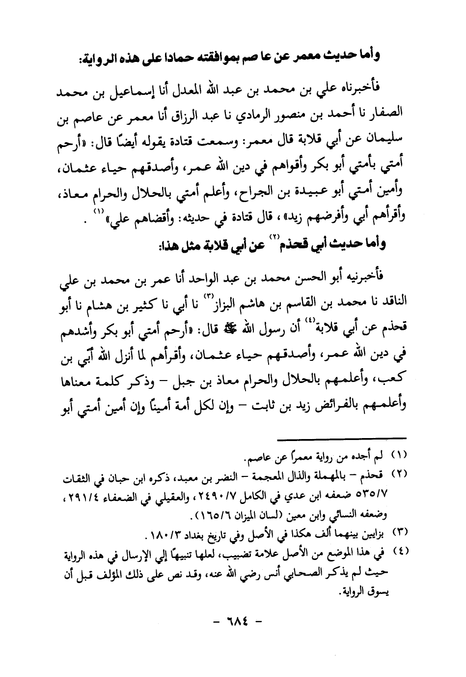 فَأَخْبَرَنَاهُ عَلِيُّ بْنُ مُحَمَّدِ بْنِ عَبْدِ اللَّهِ الْمُعَدَّلُ، أنا إِسْمَاعِيلُ بْنُ مُحَمَّدٍ الصَّفَّارُ، نا أَحْمَدُ بن منصور الرمادي، نا عبد الرزاق، أنا معمر، عن عاصم بن سليمان، عن أبي قلابة، قال معمر: وسمعت قتادة يقوله أيضا، قال: "أرحم أمتي بأمتي أبو بكر، وأقواهم في دين اللَّهِ عُمَرُ، وَأَصْدَقُهُمْ حَيَاءً عُثْمَانُ، وأمين أمتي أبو عبيدة بن الجراح، وأعلم أمتي بالحلال والحرام معاذ، وأقرأهم أُبيّ، وأفرضهم زيد"، قال قتادة في حديثه: "وأقضاهم علي" 1.
