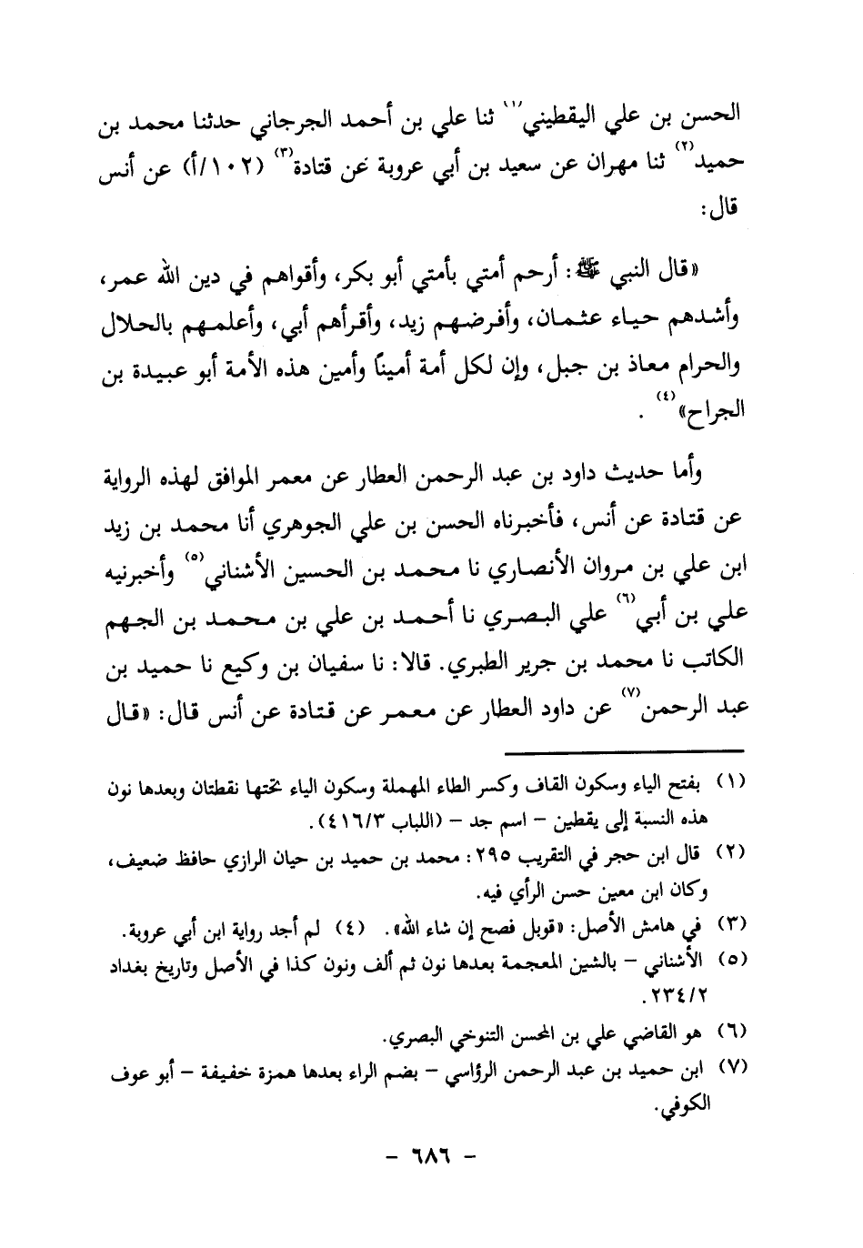 الْحَسَنِ بْنِ عَلِيٍّ الْيَقْطِينِيُّ1، ثنا عَلِيُّ بْنُ أَحْمَدَ الْجُرْجَانِيُّ، حَدَّثَنَا مُحَمَّدُ بْنُ حُمَيْدٍ2، ثنا مِهْرَانُ عَنْ سَعِيدِ بْنِ أَبِي عَرُوبَةَ، عن قتادة3 (102/أ) عَنْ أَنَسٍ، قَالَ: قَالَ النَّبِيُّ صَلَّى اللَّهُ عَلَيْهِ وَسَلَّمَ: