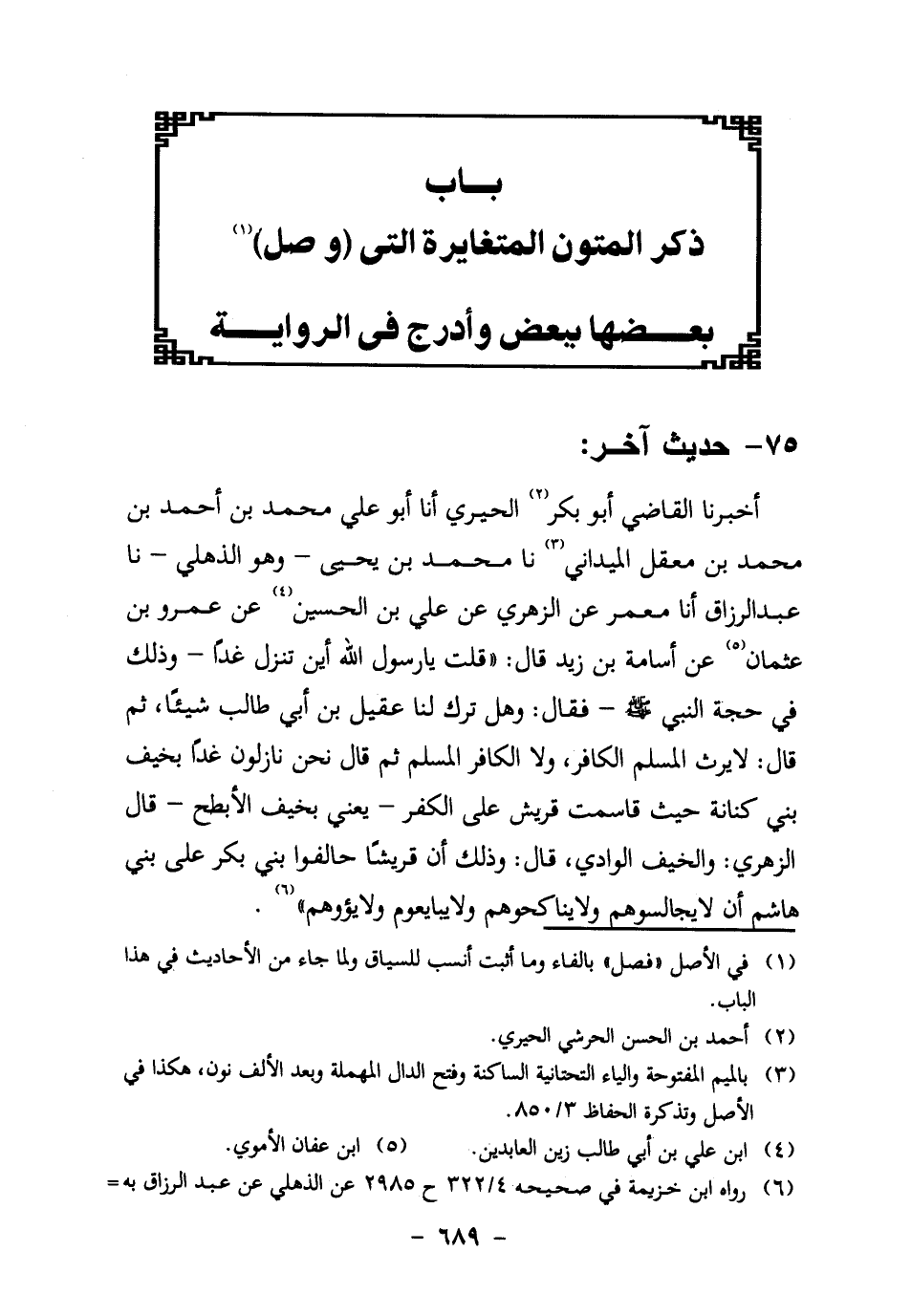 ابن يحيى ـ هو الذُّهْلِيُّ ـ نا عَبْدُ الرَّزَّاقِ، أنا مَعْمَرٌ، عَنِ الزُّهْرِيِّ، عَنْ عَلِيِّ بن الحسين4، عن عمرو ابن عُثْمَانَ5،