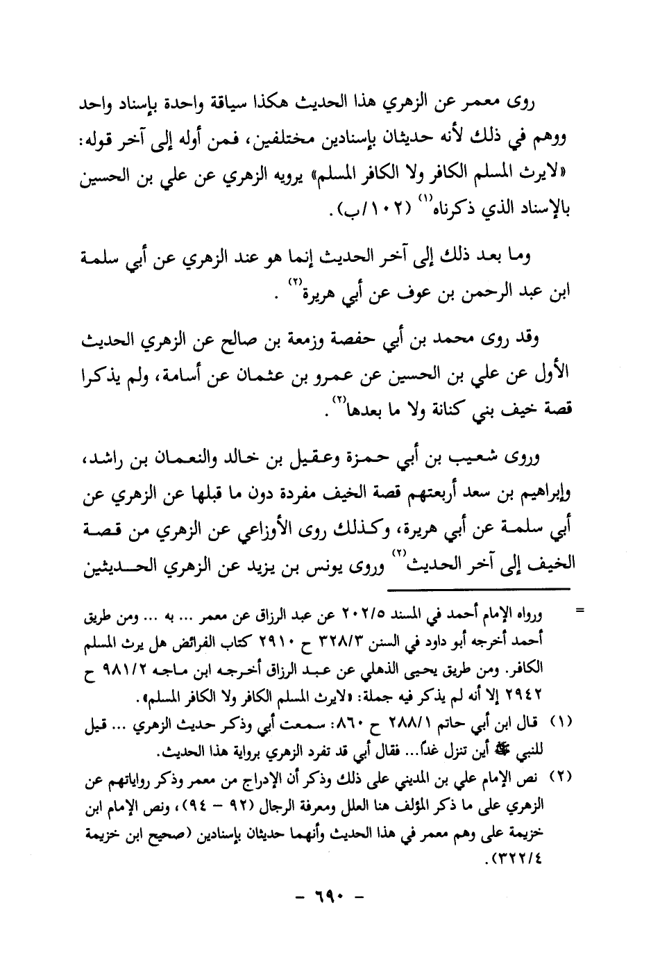 رَوَى مَعْمَرٌ عَنِ الزُّهْرِيِّ هَذَا الْحَدِيثَ هَكَذَا سِيَاقَةً وَاحِدَةً بِإِسْنَادٍ وَاحِدٍ وَوَهِمَ فِي ذَلِكَ، لأَنَّهُ حَدِيثَانِ بِإِسْنَادَيْنِ مُخْتَلِفَيْنِ، فَمِنْ أَوَّلِهِ إِلَى آخِرِ قَوْلِهِ: "لا يَرِثُ الْمُسْلِمُ الْكَافِرَ، وَلا الْكَافِرُ الْمُسْلِمَ" يَرْوِيهِ الزُّهْرِيُّ عَنْ عَلِيِّ بْنِ الحسين بالإسناد الذي ذكرناه1. (102/ب)