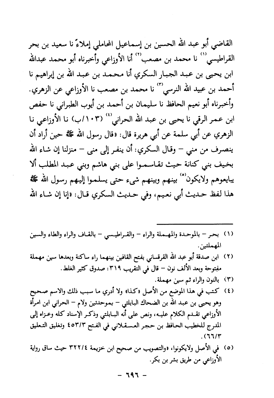 وأخبرناه أَبُو نُعَيْمٍ الْحَافِظُ، نا سُلَيْمَانُ بْنُ أَحْمَدَ بْنِ أَيُّوبَ الطَّبَرَانِيُّ، نا حَفْصُ بْنُ عُمَرَ الرَّقِّيُّ، نا يَحْيَى بْنُ عَبْدِ اللَّهِ الحراني4 (103/ب) نا الأَوْزَاعِيُّ، نا الزُّهْرِيُّ عَنْ أَبِي سَلَمَةَ، عَنْ أَبِي هُرَيْرَةَ قَالَ: "قَالَ رَسُولُ اللَّهِ صَلَّى اللَّهُ عَلَيْهِ وَسَلَّمَ حِينَ أَرَادَ أَنْ يَنْصَرِفَ مِنْ مِنًى ـ وَقَالَ السُّكَّرِيُّ: أَنْ يَنْفِرَ إِلَى مِنًى ـ: مَنْزِلُنَا غَدًا إِنْ شَاءَ اللَّهُ بِخَيْفِ بَنِي كِنَانَةَ حَيْثُ تَقَاسَمُوا على بني هاشم وبني عبد المطلب ألا يبايعوهم، ولا يكون5 بَيْنَهُمْ وَبَيْنَهُمْ شَيْءٌ حَتَّى يُسْلِمُوا إِلَيْهِمْ رَسُولُ اللَّهِ صَلَّى اللَّهُ عَلَيْهِ وَسَلَّمَ".