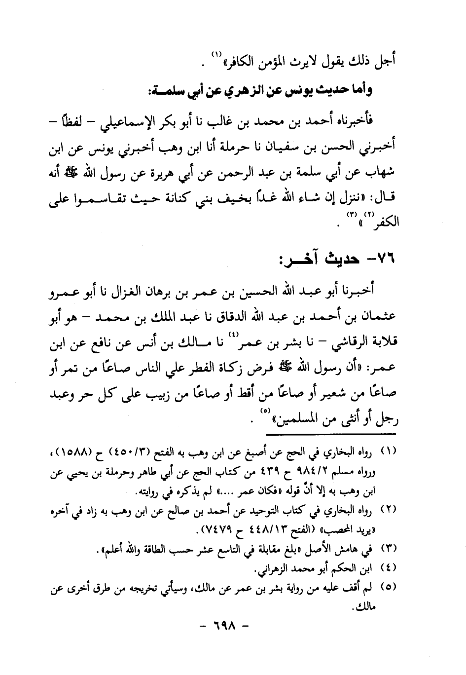 أنا ابْنُ وَهْبٍ، أَخْبَرَنِي يُونُسَ عَنِ ابْنِ شِهَابٍ، عَنْ أَبِي سَلَمَةَ بْنِ عَبْدِ الرَّحْمَنِ، عَنْ أَبِي هُرَيْرَةَ، عَنْ رَسُولِ الله صَلَّى اللَّهُ عَلَيْهِ وَسَلَّمَ أَنَّهُ قَالَ: "نَنْزِلُ إِنْ شَاءَ اللَّهُ غَدًا بِخَيْفِ بَنِي كِنَانَةَ حَيْثُ تَقَاسَمُوا عَلَى الْكُفْرِ" 2. 3