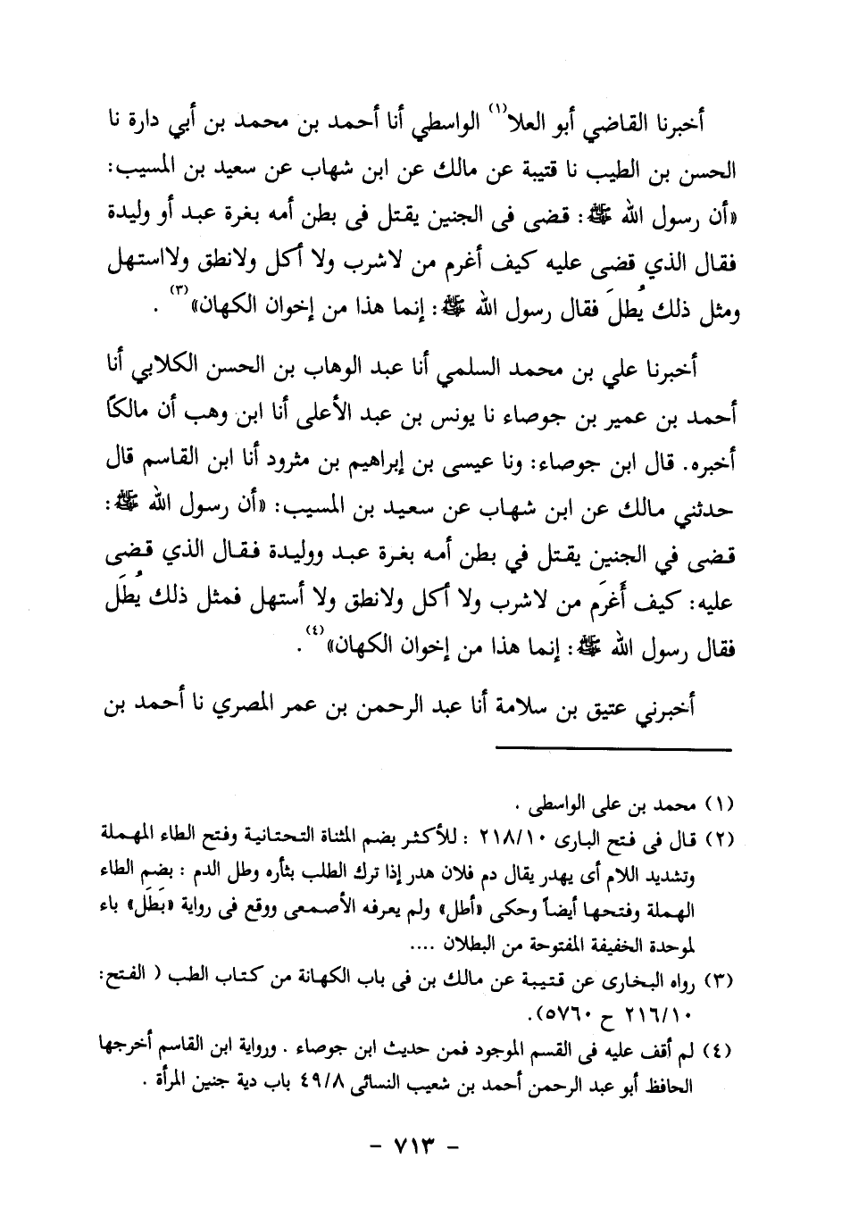 ابْنُ عَبْدِ الأَعْلَى، أنا ابْنُ وَهْبٍ، أَنَّ مَالِكًا أَخْبَرَهُ. قَالَ ابْنُ جَوْصَاءَ: ونا عِيسَى بْنُ إِبْرَاهِيمَ بْنِ مَثْرُودٍ، أنا ابْنُ الْقَاسِمِ قَالَ: حَدَّثَنِي مَالِكٌ عَنِ ابْنِ شِهَابٍ، عَنْ سَعِيدِ بْنِ الْمُسَيِّبِ: "أَنَّ رَسُولَ اللَّهِ صَلَّى اللَّهُ عَلَيْهِ وَسَلَّمَ قَضَى فِي الْجَنِينِ يُقْتَلُ فِي بَطْنِ أُمِّهِ بغرة عبد ووليدة، فَقَالَ الَّذِي قَضَى عَلَيْهِ: كَيْفَ أَغْرَمُ مَنْ لا شَرِبَ وَلا أَكَلَ، وَلا نَطَقَ وَلا اسْتَهَلَّ، فَمِثْلُ ذَلِكَ يُطَل، فَقَالَ رَسُولُ الله صَلَّى اللَّهُ عَلَيْهِ وَسَلَّمَ: إِنَّمَا هَذَا مِنْ إِخْوَانُ الْكُهَّانِ" 4.