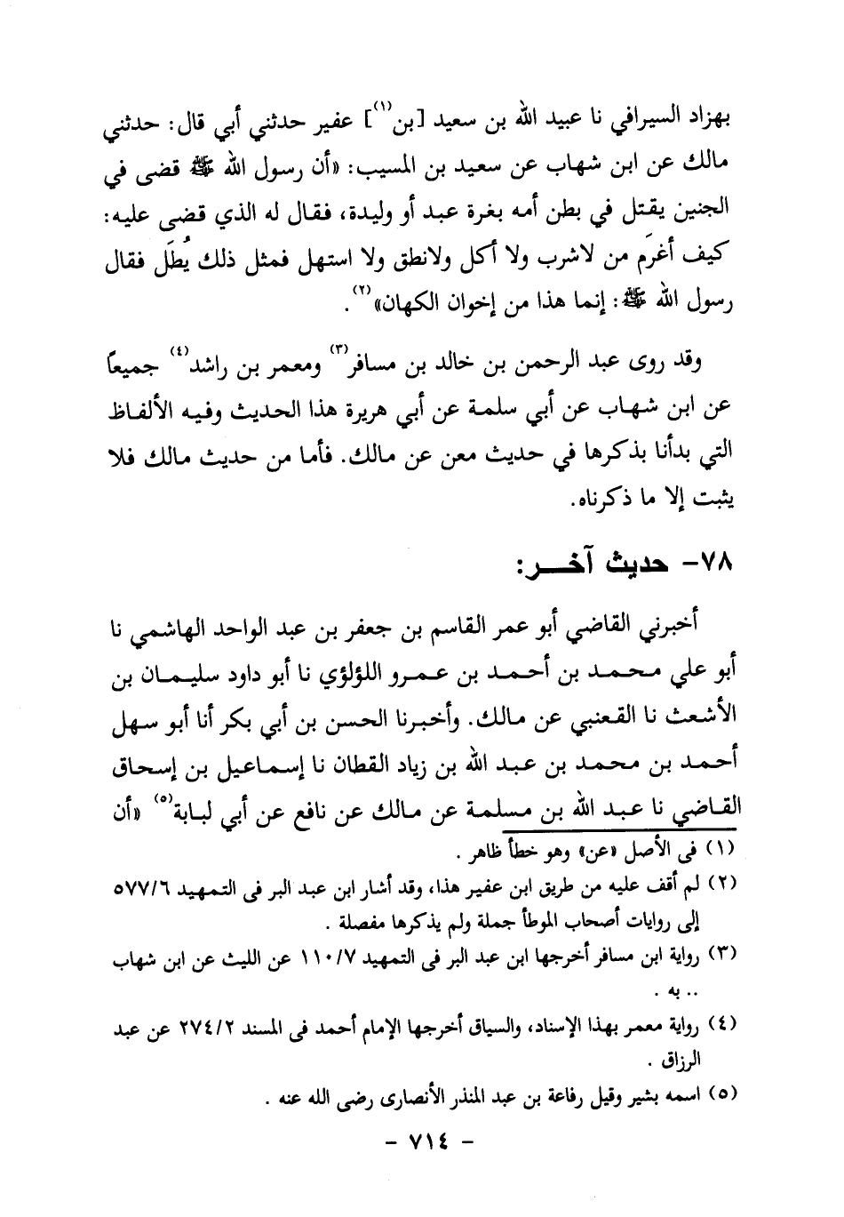 ابن الْمُسَيِّبِ: "أَنَّ رَسُولَ اللَّهِ صَلَّى اللَّهُ عَلَيْهِ وَسَلَّمَ قَضَى فِي الْجَنِينِ يُقْتَلُ فِي بَطْنِ أُمِّهِ بِغُرَّةِ عَبْدٍ أَوْ وَلِيدَةٍ، فَقَالَ لَهُ الَّذِي قَضَى عَلَيْهِ: كَيْفَ أَغْرَمُ مَنْ لا شَرِبَ وَلا أَكَلَ، وَلا نَطَقَ وَلا اسْتَهَلَّ، فَمِثْلُ ذَلِكَ يُطَل، فَقَالَ رَسُولُ الله صَلَّى اللَّهُ عَلَيْهِ وَسَلَّمَ: إِنَّمَا هَذَا مِنْ إِخْوَانُ الْكُهَّانِ" 2.