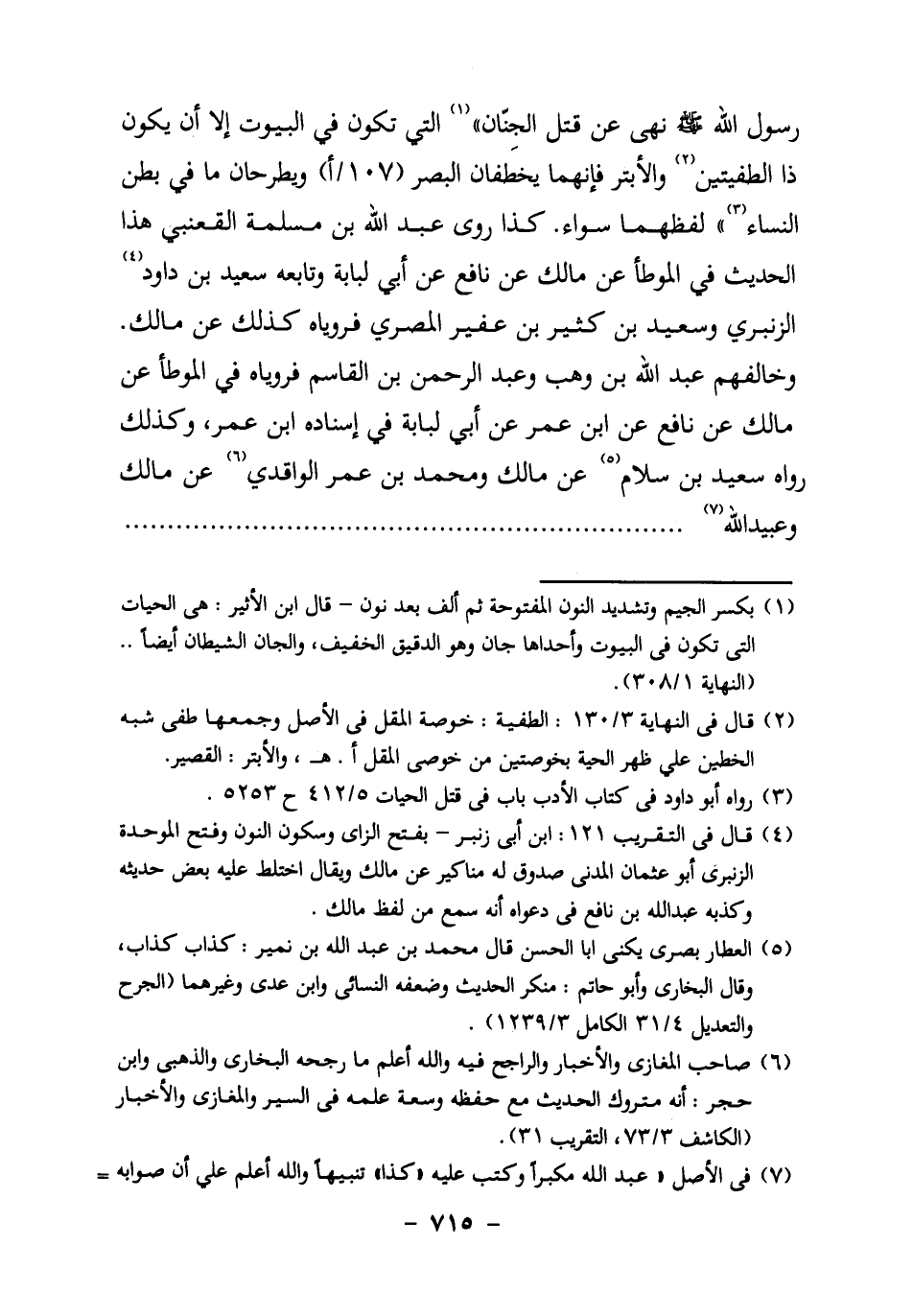رسول الله صَلَّى اللَّهُ عَلَيْهِ وَسَلَّمَ نَهَى عَنْ قَتْلِ الجِنّان1 الَّتِي تَكُونُ فِي الْبُيُوتِ، إِلا أَنْ يَكُونَ ذَا الطُّفْيَتَيْنِ2 وَالأَبْتَرَ، فإنهما يخطفان البصر (107/أ) ويطرحان ما في بطن النِّسَاءِ" 3، لَفْظُهُمَا سَوَاءٌ.