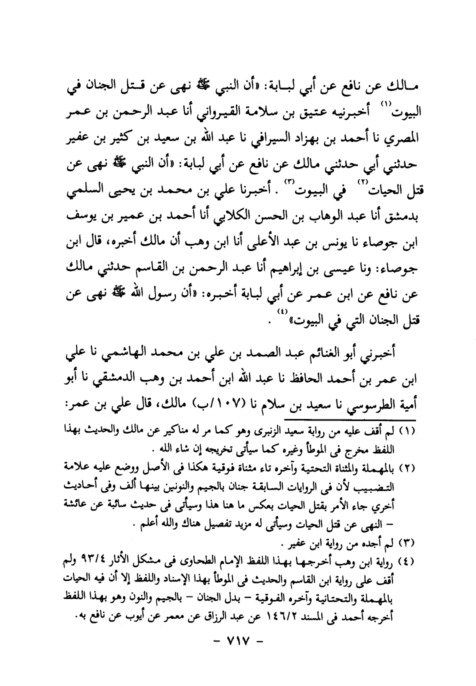 أنا عَبْدُ الرَّحْمَنِ بْنُ الْقَاسِمِ، حَدَّثَنِي مَالِكٌ عَنْ نَافِعٍ، عَنِ ابْنِ عُمَرَ، عَنْ أَبِي لُبَابَةَ أَخْبَرَهُ: "أَنَّ رَسُولَ اللَّهِ صَلَّى اللَّهُ عَلَيْهِ وَسَلَّمَ نَهَى عَنْ قَتْلِ الجنان التي فِي الْبُيُوتِ" 4.
