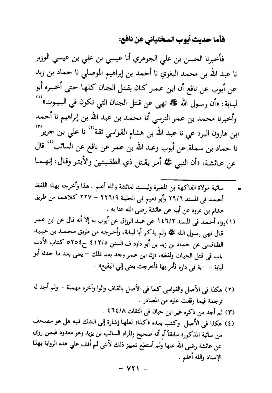 ابن إِبْرَاهِيمَ الْمَوْصِلِيُّ، نَا حَمَّادُ بْنُ زَيْدٍ عَنْ أَيُّوبَ، عَنْ نَافِعٍ أَنَّ ابْنَ عُمَرَ كَانَ يَقْتُلُ الْجِنَانَ كُلَّهَا حَتَّى أَخْبَرَهُ أَبُو لُبَابَةَ: "أَنَّ رَسُولَ اللَّهِ صَلَّى اللَّهُ عَلَيْهِ وَسَلَّمَ نَهَى عَنْ قَتْلِ الْجِنَانِ الَّتِي تَكُونُ فِي البيوت" 1.