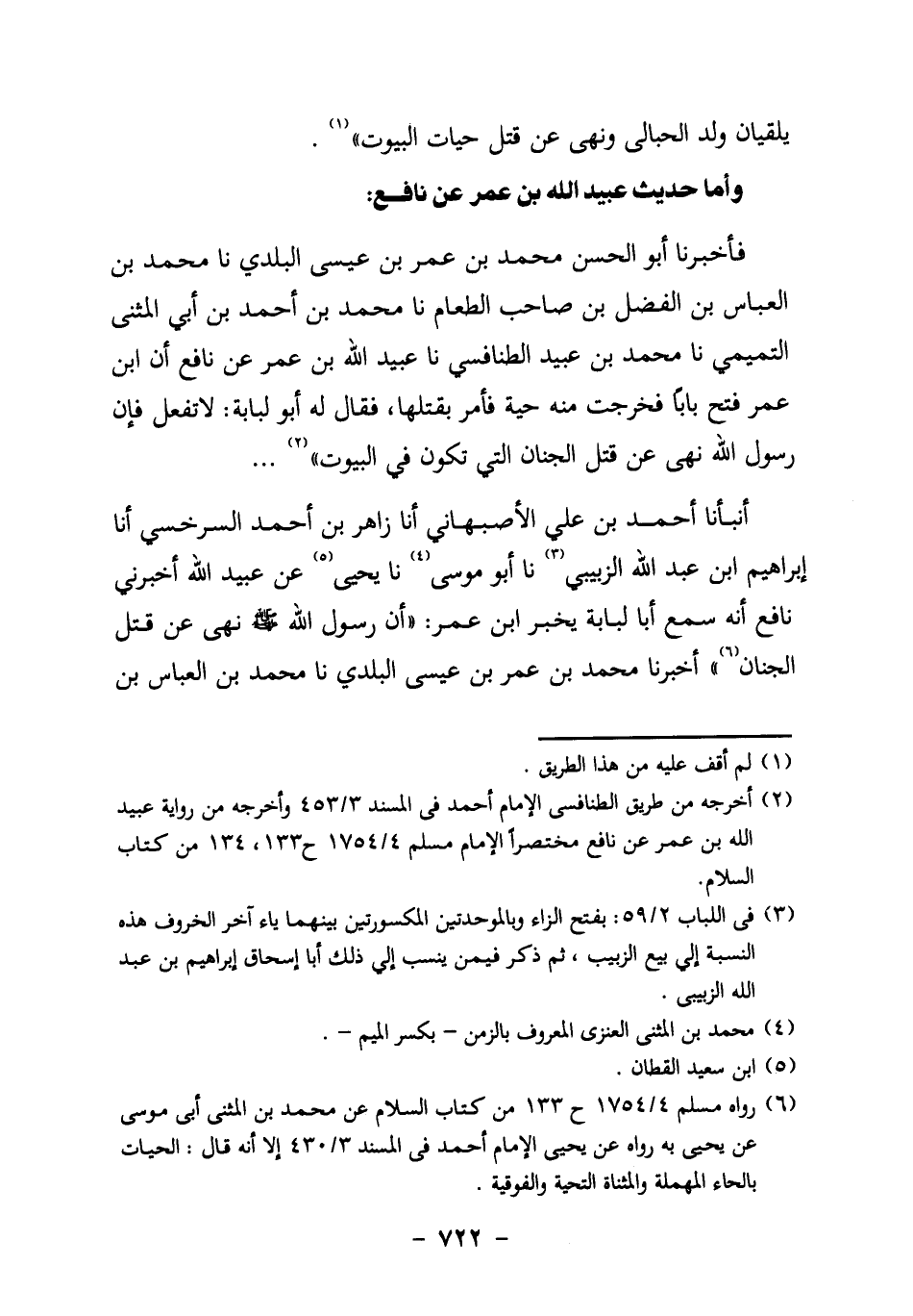 ابن أَحْمَدَ بْنِ أَبِي الْمُثَنَّى التَّمِيمِيُّ، نا مُحَمَّدُ بْنُ عُبَيْدٍ الطَّنَافِسِيُّ، نا عبيد الله بن عمر، عَنْ نَافِعٍ أَنَّ ابْنَ عُمَرَ فَتَحَ بَابًا، فَخَرَجَتْ مِنْهُ حَيَّةٌ فَأَمَرَ بِقَتْلِهَا، فَقَالَ لَهُ أَبُو لُبَابَةَ: لا تَفْعَلْ، فَإِنَّ رَسُولَ الله صَلَّى اللَّهُ عَلَيْهِ وَسَلَّمَ نَهَى عَنْ قَتْلِ الْجِنَانِ الَّتِي تكون في البيوت" 2 ...