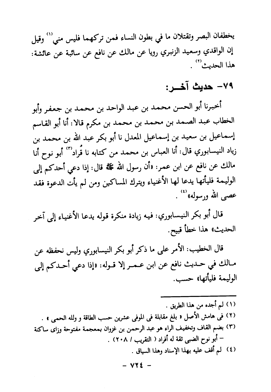 قَالَ الْخَطِيبُ: الأَمْرُ عَلَى مَا ذَكَرَ أَبُو بَكْرٍ النيسابوري، وليس نحفظه عَنْ مَالِكٍ فِي حَدِيثِ نَافِعٍ عَنِ ابْنِ عُمَرَ إِلا قَوْلُهُ: "إِذَا دُعِيَ أَحَدُكُمْ إِلَى الْوَلِيمَةِ فليأتها" حسب.