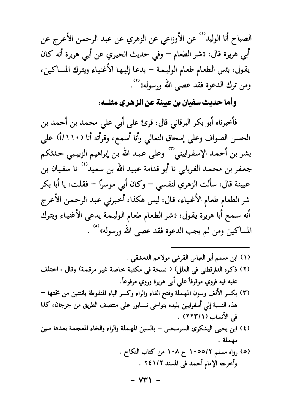الصباح، أنا الوليد1، عن الأوزاعي، عن الزهري، عن عبد الرحمن الأعرج، عن أبي هريرة قال: "شر الطعام ـ