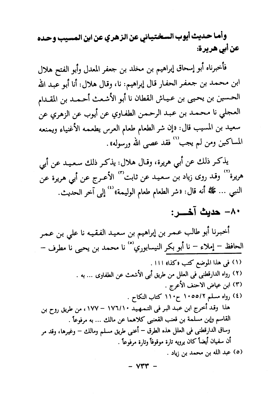 ابن عَبْدِ الرَّحْمَنِ الطُّفَاوِيُّ عَنْ أَيُّوبَ، عن الزهري، عن سعيد بن المسيب قال: "شَرَّ الطَّعَامِ طَعَامُ الْعُرْسِ يُطْعَمُهُ الأَغْنِيَاءُ، وَيُمْنَعُهُ الْمَسَاكِينُ، وَمَنْ لَمْ يَجِبْ1 فَقَدْ عَصَى اللَّهَ وَرَسُولَهُ".