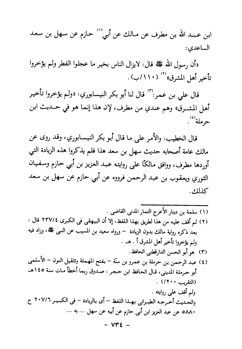 قَالَ عَلِيُّ بْنُ عُمَرَ3: قَالَ لَنَا أَبُو بَكْرٍ النَّيْسَابُورِيُّ: "وَلَمْ يُؤَخِّرُوا تَأْخِيرَ أَهْلِ الْمَشْرِقِ"، وَهُمْ عِنْدِي مِنْ مُطَرِّفٍ، لأَنَّ هَذَا إِنَّمَا هُوَ فِي حَدِيثِ ابْنِ حَرْمَلَةَ4.