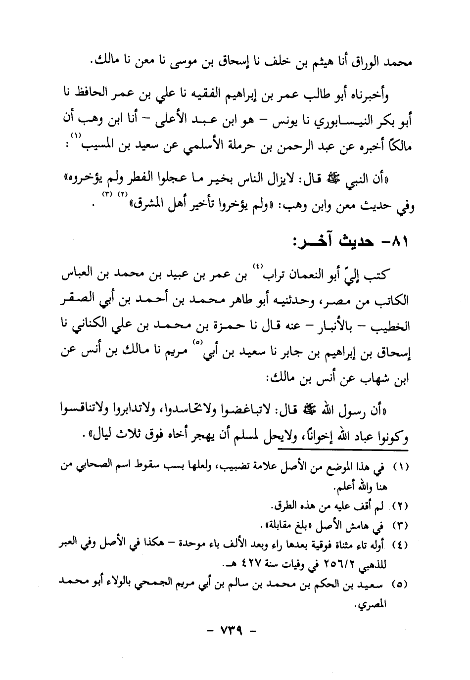 "أَنَّ رسول الله صَلَّى اللَّهُ عَلَيْهِ وَسَلَّمَ قَالَ: لا تَبَاغَضُوا وَلا تَحَاسَدُوا، وَلا تَدَابَرُوا وَلا تَنَافَسُوا، وَكُونُوا عِبَادَ اللَّهِ إِخْوَانًا، وَلا يَحِلُّ لِمُسْلِمٍ أَنْ يَهْجُرَ أَخَاهُ فوق ثلاث ليال".