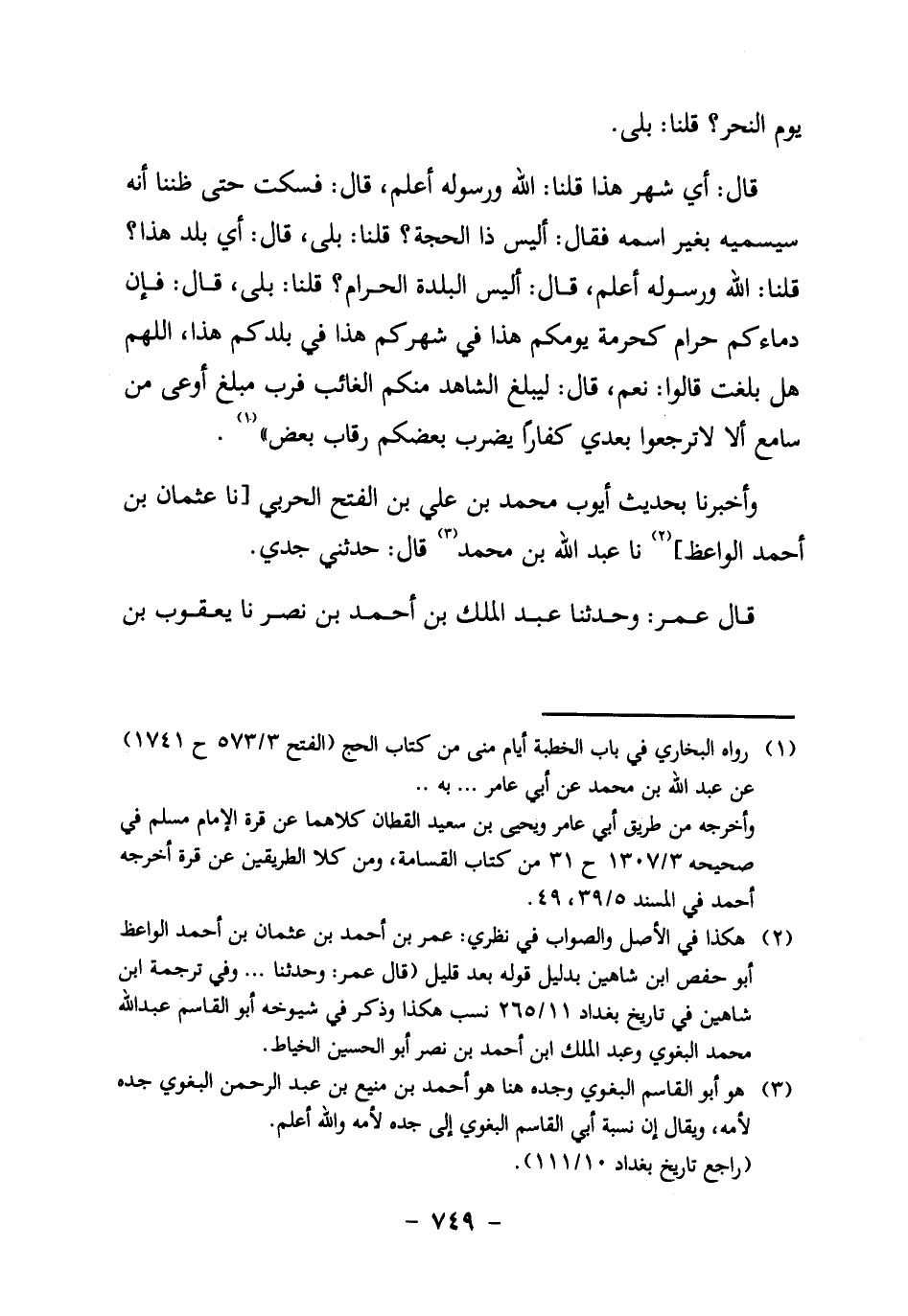 1 رواه البخاري في باب الخطبة أيام منى من كتاب الحج، الفتح 3/ 573 ح 1741 عن عبد الله بن محمد، عن أبي عامر ... به.