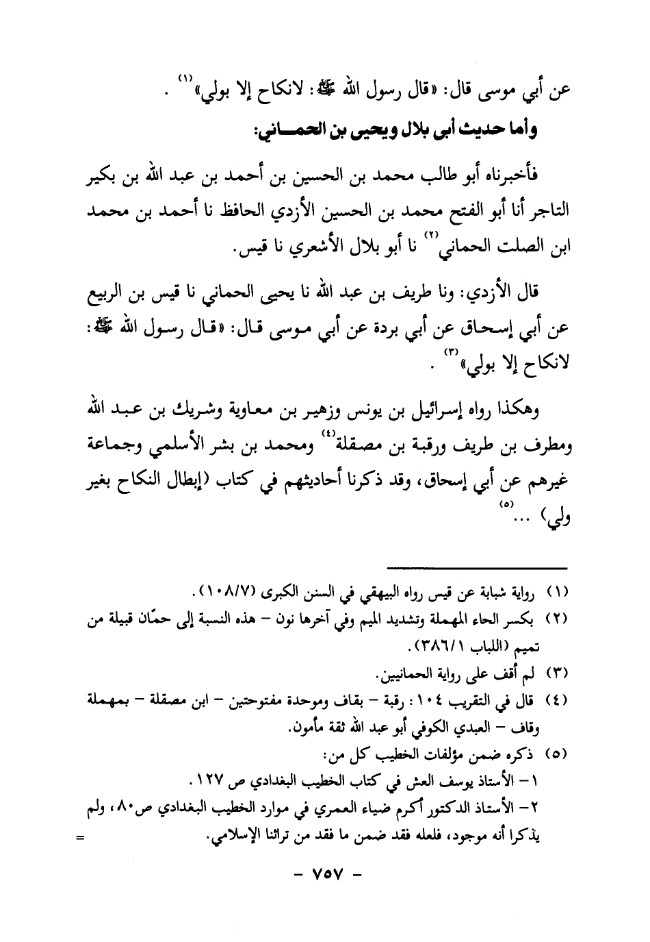 قَالَ الأزدي: ونا طريف بن عبد اللَّهِ، نا يَحْيَى الْحِمَّانِيُّ، نا قَيْسُ بْنُ الرَّبِيعِ، عَنْ أَبِي إِسْحَاقَ، عَنْ أَبِي بُرْدَةَ، عَنْ أَبِي مُوسَى قَالَ: "قَالَ رَسُولُ الله صَلَّى اللَّهُ عَلَيْهِ وَسَلَّمَ: لا نِكَاحَ إِلا بِوَلِيٍّ" 3.