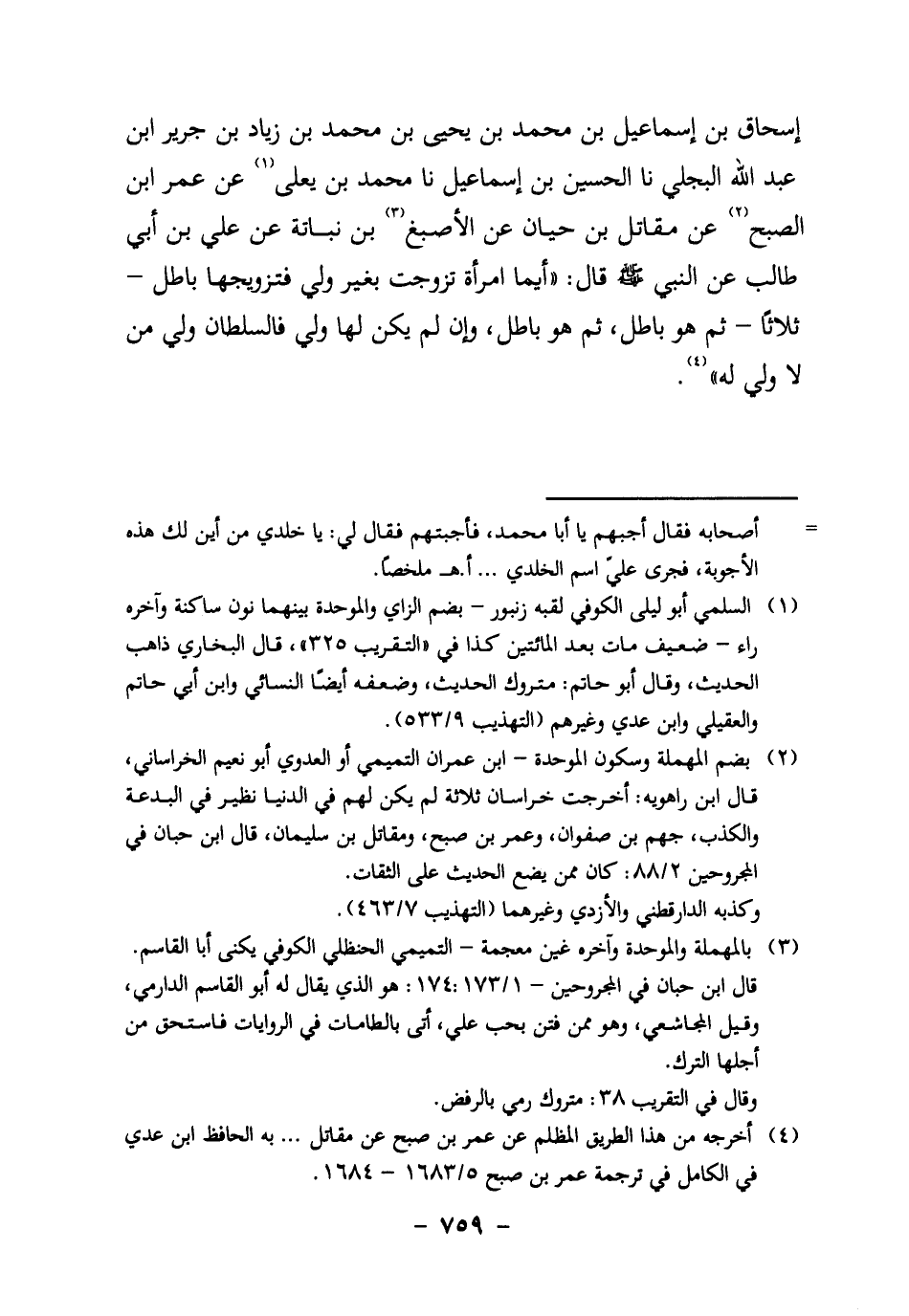 ابن إِسْمَاعِيلَ، نا مُحَمَّدُ بْنُ يَعْلَى1 عَنْ عُمَرَ بْنِ الصّبحِ2، عَنْ مقاتل بن حيان، عن الأصبغ3 بْنِ نُبَاتَةَ، عَنْ عَلِيِّ بْنِ أَبِي طَالِبٍ، عَنِ النَّبِيِّ صَلَّى اللَّهُ عَلَيْهِ وَسَلَّمَ: "أَيُّمَا امْرَأَةٍ تَزَوَّجَتْ بِغَيْرِ وَلِيٍّ فَتَزْوِيجُهَا بَاطِلٌ ـ ثَلاثًا ـ ثُمَّ هُوَ بَاطِلٌ، ثُمَّ هُوَ بَاطِلٌ، وَإِنْ لَمْ يَكُنْ لَهَا وَلِيٌّ فَالسُّلْطَانُ وَلِيُّ مَنْ لا وَلِيَّ لَهُ" 4.