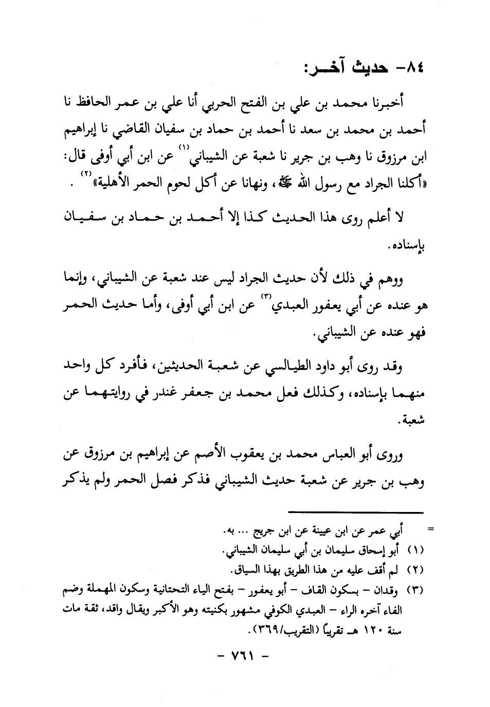 أخبرنا مُحَمَّدُ بْنُ عَلِيِّ بْنِ الْفَتْحِ الْحَرْبِيُّ، أنا عَلِيُّ بْنُ عُمَرَ الْحَافِظُ، نا أَحْمَدُ بْنُ مُحَمَّدِ بْنِ سَعْدٍ، نا أَحْمَدُ بْنُ حماد ابن سُفْيَانَ الْقَاضِي، نا إِبْرَاهِيمُ بْنُ مَرْزُوقٍ، نا وَهْبُ بْنُ جَرِيرٍ، نا شُعْبَةُ، عَنِ الشَّيْبَانِيِّ1 عَنِ ابْنِ أَبِي أَوْفَى قَالَ: "أَكَلْنَا الْجَرَادَ مَعَ رَسُولِ اللَّهِ صَلَّى اللَّهُ عَلَيْهِ وَسَلَّمَ وَنَهَانَا عَنْ أَكْلِ لُحُومِ الْحُمُرِ الأَهْلِيَّةِ" 2.
