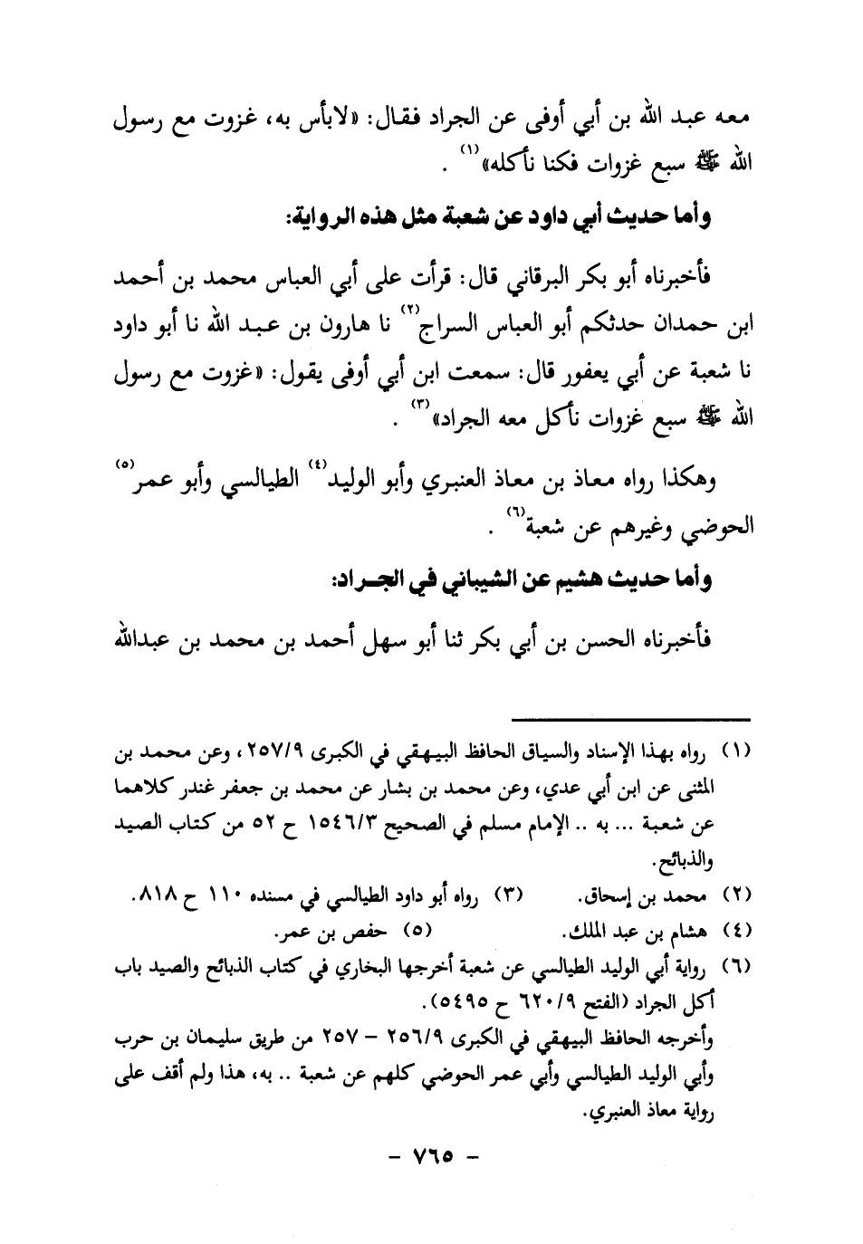فَأَخْبَرَنَاهُ أَبُو بَكْرٍ الْبَرْقَانِيُّ قَالَ: قَرَأْتُ عَلَى أَبِي الْعَبَّاسِ مُحَمَّدِ بْنِ أَحْمَدَ بْنِ حَمْدَانَ، حَدَّثَكُمْ أَبُو الْعَبَّاسِ السَّرَّاجُ2، نا هَارُونُ بْنُ عَبْدِ اللَّهِ، نا أَبُو دَاوُدَ، نا شُعْبَةُ، عَنْ أَبِي يَعْفُورٍ قَالَ: سَمِعْتُ ابْنَ أَبِي أَوْفَى يَقُولُ: "غَزَوْتُ مَعَ رَسُولِ اللَّهِ صَلَّى اللَّهُ عَلَيْهِ وَسَلَّمَ سَبْعَ غَزَوَاتٍ نَأْكُلُ مَعَهُ الْجَرَادَ" 3.
