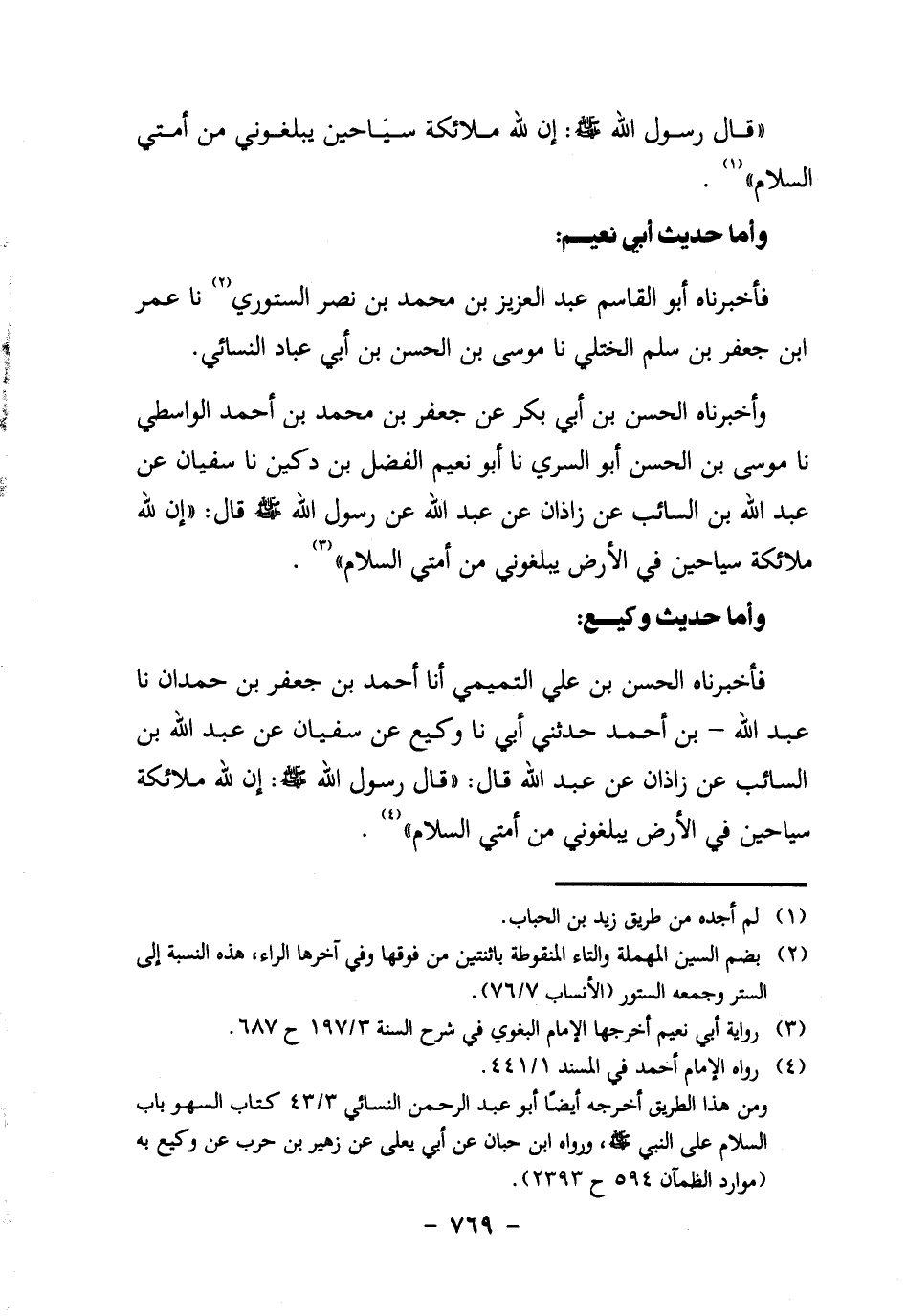 فأخبرناه الْحَسَنُ بْنُ عَلِيٍّ التَّمِيمِيُّ، أنا أَحْمَدُ بْنُ جَعْفَرِ بْنِ حَمْدَانَ، نا عَبْدُ اللَّهِ بْنُ أَحْمَدَ، حَدَّثَنِي أَبِي، نا وَكِيعٌ عَنْ سُفْيَانُ، عَنْ عَبْدِ اللَّهِ بْنِ السَّائِبِ، عَنْ زَاذَانَ، عَنْ عَبْدِ اللَّهِ قَالَ: "قَالَ رَسُولُ اللَّهِ صَلَّى اللَّهُ عَلَيْهِ وَسَلَّمَ: أَنْ لِلَّهِ مَلائِكَةً سَيَّاحِينَ فِي الأَرْضِ يبلغوني من أمتي السلام" 4.