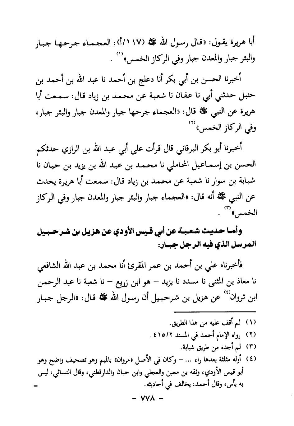 فَأَخْبَرَنَاهُ عَلِيُّ بْنُ أَحْمَدَ بْنِ عُمَرَ الْمُقْرِئُ، أنا مُحَمَّدُ بْنُ عَبْدِ اللَّهِ الشَّافِعِيُّ، نا مُعَاذُ بْنُ الْمُثَنَّى، نا مُسَدَّدٌ، نا يَزِيدُ ـ هُوَ ابْنُ زُرَيْعٍ ـ نا شُعْبَةُ، نا عَبْدُ الرَّحْمَنِ بْنُ ثَرْوَانَ4 عَنْ هُزَيْلِ بْنِ شُرَحْبِيلَ أَنَّ رَسُولَ اللَّهِ صَلَّى اللَّهُ عَلَيْهِ وَسَلَّمَ قَالَ: "الرِّجْلُ جُبَارٌ،