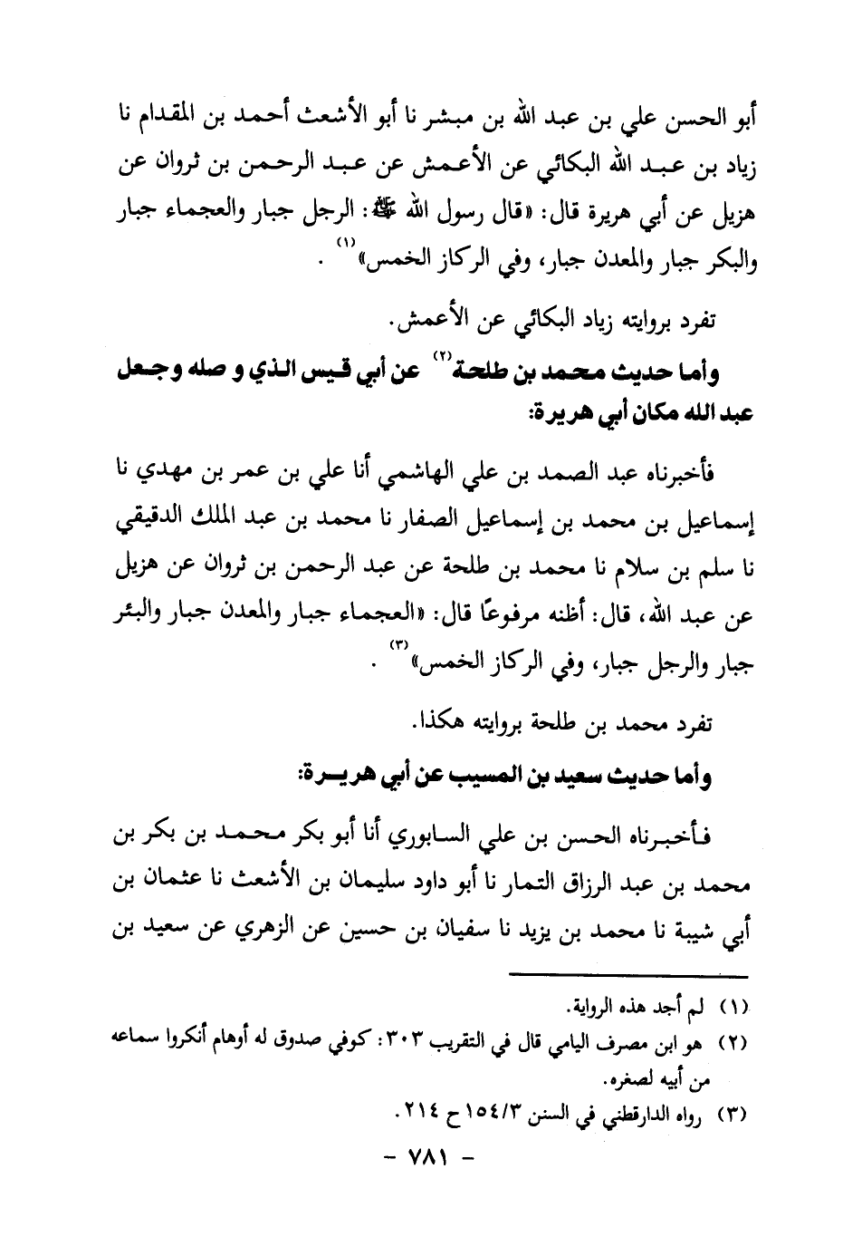 فأخبرناه عَبْدُ الصَّمَدِ بْنُ عَلِيٍّ الْهَاشِمِيُّ، أنا عَلِيُّ بْنُ عُمَرَ بْنِ مَهْدِيٍّ، نا إِسْمَاعِيلُ بْنُ مُحَمَّدِ بْنِ إِسْمَاعِيلَ الصَّفَّارُ، نا مُحَمَّدُ بْنُ عَبْدِ الْمَلِكِ الدَّقِيقِيُّ، نا سَلْمُ بْنُ سَلامٍ، نا مُحَمَّدُ بْنُ طَلْحَةَ عَنْ عَبْدِ الرَّحْمَنِ بْنِ ثَرْوَانَ، عَنْ هُزَيْلٍ، عَنْ عَبْدِ اللَّهِ، قَالَ: أَظُنُّهُ مَرْفُوعًا قَالَ: " الْعَجْمَاءُ جُبَارٌ، وَالْمَعْدِنُ جُبَارٌ، والبئر جُبَارٌ، وَالرِّجْلُ جُبَارٌ، وَفِي الرِّكَازِ الْخُمْسُ" 3.