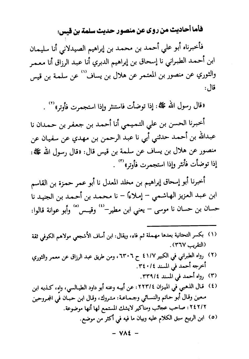 أَخْبَرَنَا الْحَسَنُ بْنُ عَلِيٍّ التَّمِيمِيُّ، أنا أَحْمَدُ بْنُ جَعْفَرِ بْنِ حمدان، نا عبد الله بن أحمد، حدثني أبي، عبد الرحمن ابْنُ مَهْدِيٍّ عَنْ سُفْيَانَ، عَنْ مَنْصُورٍ، عَنْ هِلالِ بْنِ يَسَافٍ، عَنْ سَلَمَةَ بْنِ قَيْسٍ قَالَ: "قَالَ رَسُولُ اللَّهِ صَلَّى اللَّهُ عَلَيْهِ وَسَلَّمَ: إِذَا تَوَضَّأْتَ فَانْثِرْ، وإذا استجمرت فأوتر" 3.