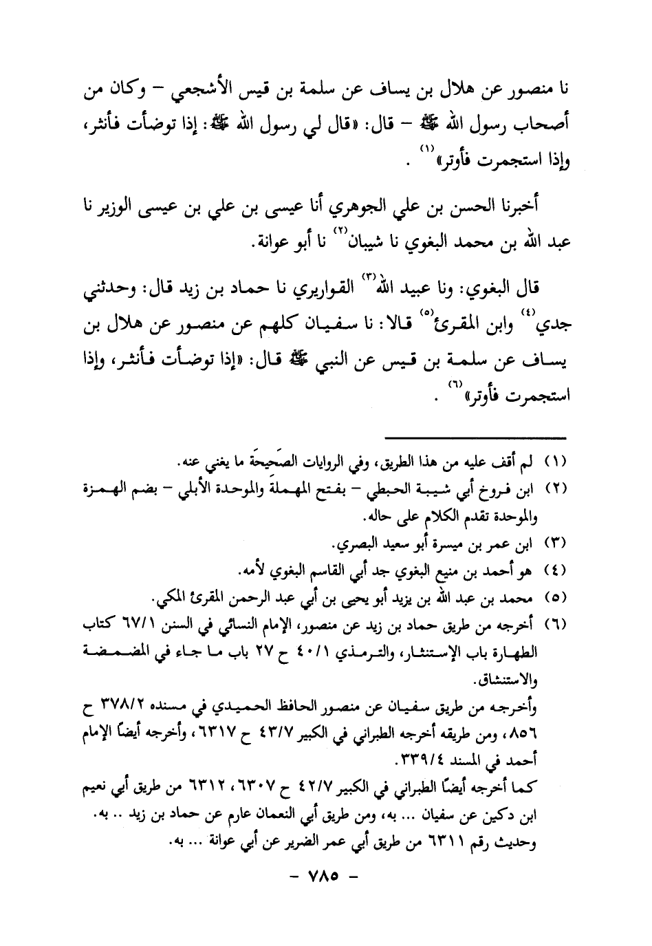 نا سُفْيَانُ، كُلُّهُمْ عَنْ مَنْصُورٍ، عَنْ هِلالِ بْنِ يَسَافٍ، عَنْ سَلَمَةَ بْنِ قَيْسٍ، عَنِ النَّبِيِّ صَلَّى اللَّهُ عَلَيْهِ وَسَلَّمَ قَالَ: "إِذَا تَوَضَّأْتَ فأنثر، وإذا استجمرت فأوتر" 6.