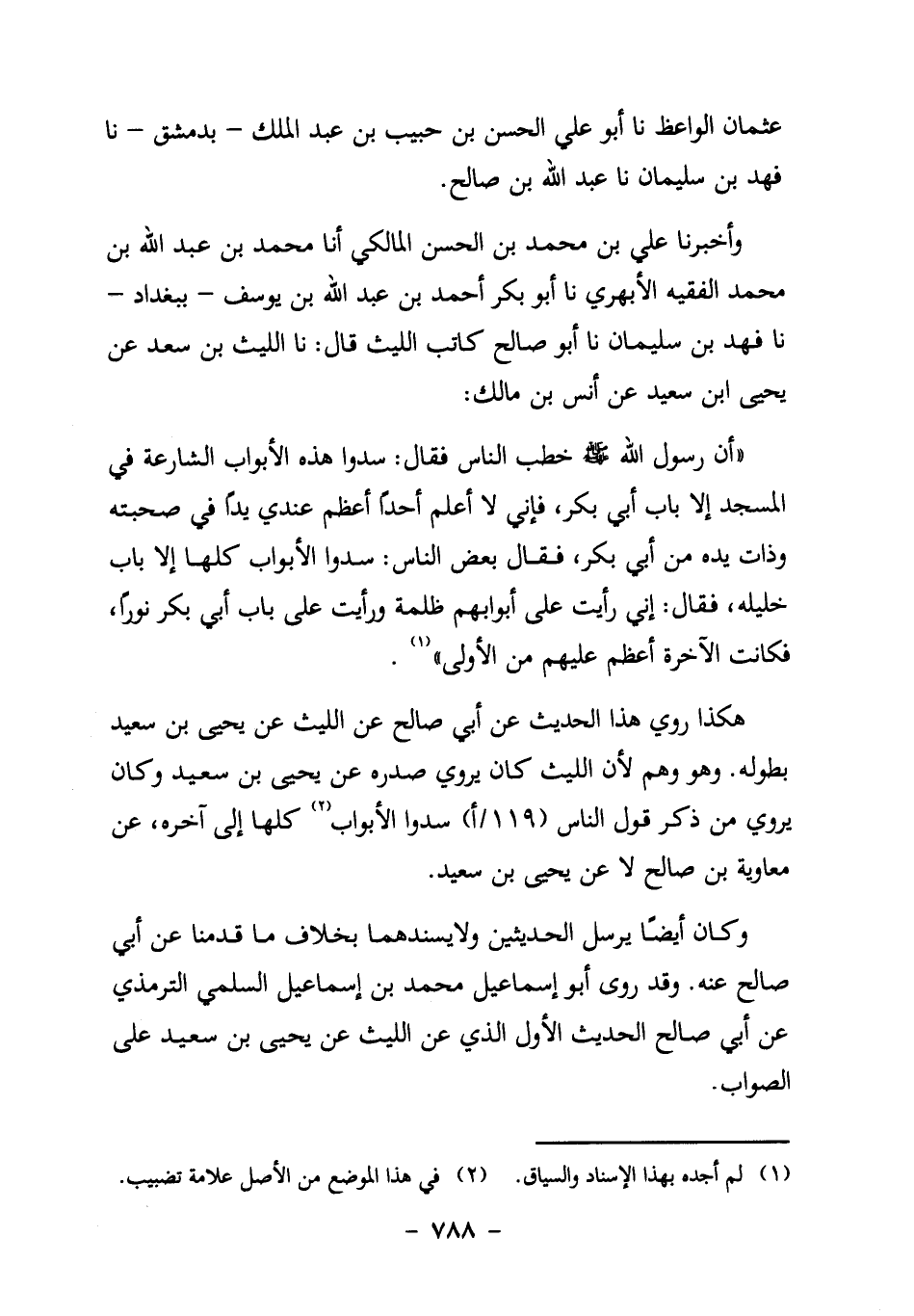 هَكَذَا رُوِيَ هَذَا الْحَدِيثُ عَنْ أَبِي صَالِحٍ، عَنِ اللَّيْثِ، عَنْ يَحْيَى بْنِ سَعِيدٍ بِطُولِهِ، وَهُوَ وَهْمٌ، لأَنَّ اللَّيْثَ كَانَ يَرْوِي صَدْرَهُ عَنْ يَحْيَى بْنِ سَعِيدٍ، وَكَانَ يَرْوِي من ذكر قول الناس (119/أ) سُدُّوا الأَبْوَابَ2 كُلَّهَا