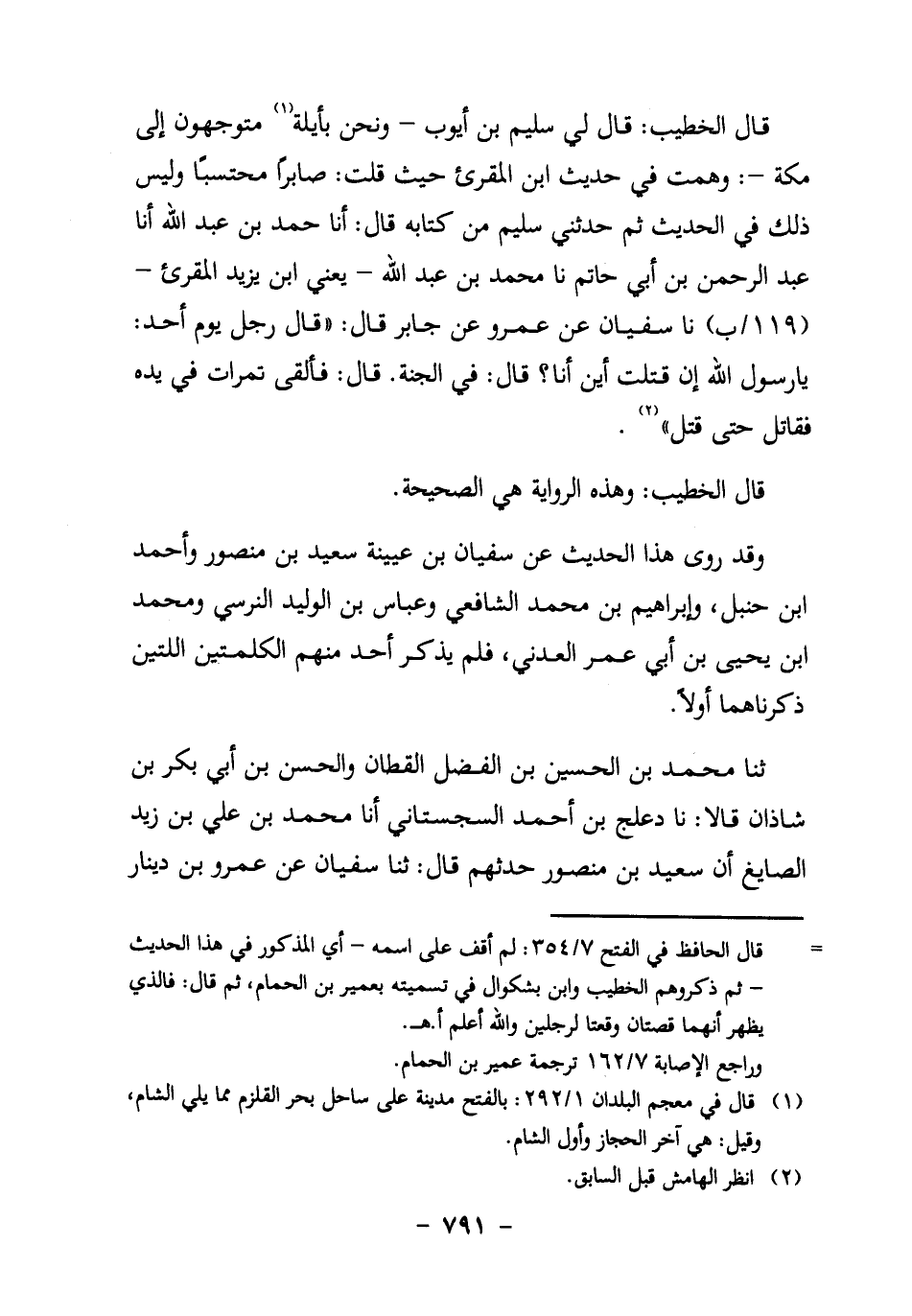 قَالَ الْخَطِيبُ: قَالَ لِي سُلَيْمُ بْنُ أَيُّوبَ ـ وَنَحْنُ بِأَيْلَةَ1 مُتَوَجِّهُونَ إِلَى مَكَّةَ ـ: وَهِمْتَ فِي حَدِيثِ ابْنِ الْمُقْرِئِ حَيْثُ قُلْتُ: صَابِرًا مُحْتَسِبًا، وَلَيْسَ ذَلِكَ فِي الْحَدِيثِ، ثُمَّ حَدَّثَنِي سُلَيْمٌ مِنْ كِتَابِهِ قَالَ: أنا حَمْدُ بْنُ عَبْدِ اللَّهِ،