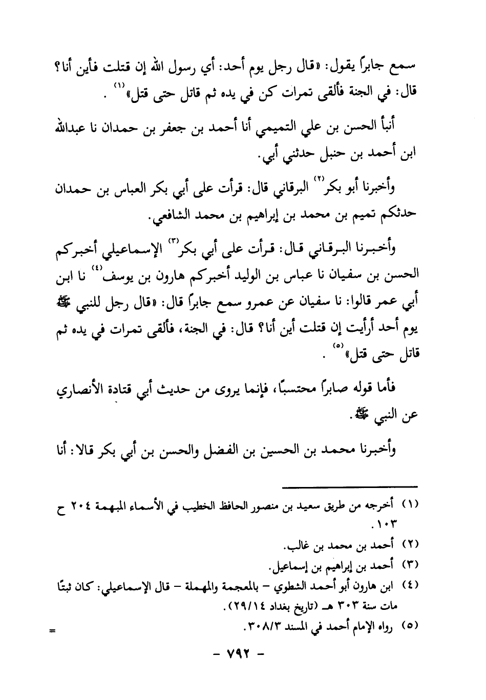 وأخبرنا الْبَرْقَانِيُّ قَالَ: قَرَأْتُ عَلَى أَبِي بكر3 الإسماعيلي؛ أخبركم الْحَسَنُ بْنُ سُفْيَانَ، نا عَبَّاسُ بْنُ الْوَلِيدِ، أَخْبَرَكُمْ هَارُونُ بْنُ يُوسُفَ4، نا ابْنُ أَبِي عُمَرَ قَالُوا: نا سُفْيَانُ عَنْ عَمْرٍو سمع جَابِرًا قَالَ: "قَالَ رَجُلٌ لِلنَّبِيِّ صَلَّى اللَّهُ عَلَيْهِ وَسَلَّمَ يَوْمَ أُحُدٍ: أَرَأَيْتَ إِنْ قُتِلْتُ أَيْنَ أَنَا؟ قَالَ: فِي الْجَنَّةِ، فَأَلْقَى تَمَرَاتٍ فِي يَدِهِ، ثُمَّ قَاتَلَ حَتَّى قُتِلَ" 5.