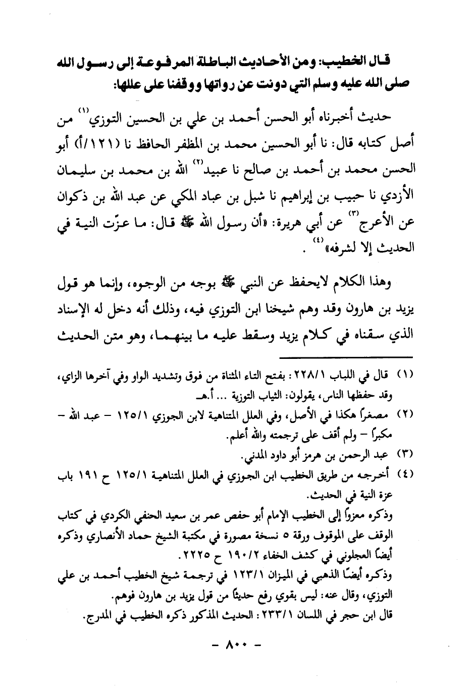 4 أخرجه من طريق الخطيب ابن الجوزي في العلل المتناهية 1/ 125 ح 191 باب عزة النية في الحديث.