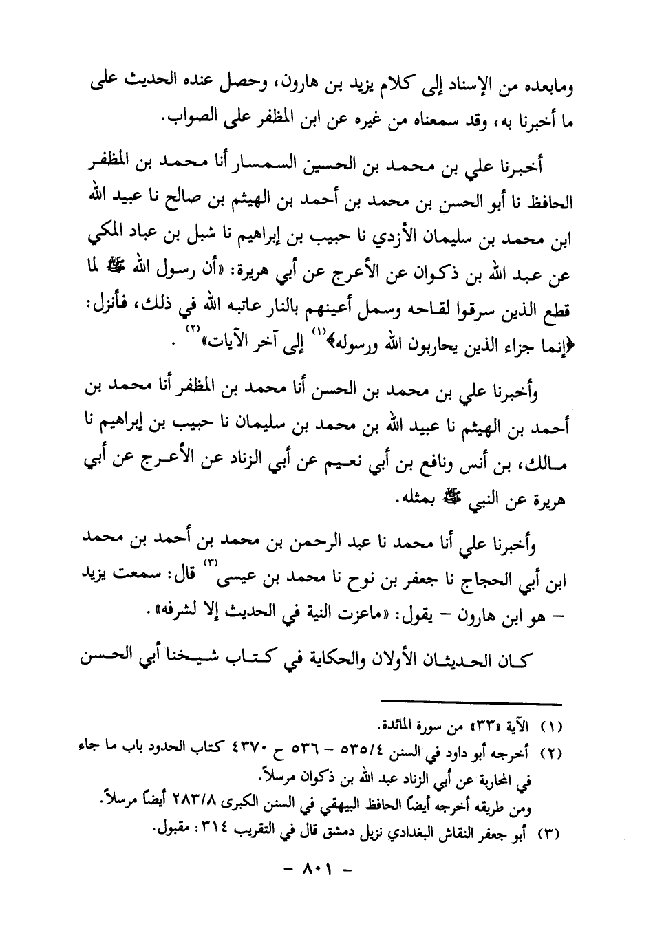 ابن الهيثم بْنِ صَالِحٍ، نا عُبَيْدُ اللَّهِ بْنُ مُحَمَّدِ بْنِ سُلَيْمَانَ الأَزْدِيُّ، نا حَبِيبُ بْنُ إِبْرَاهِيمَ، نا شِبْلُ بْنُ عَبَّادٍ الْمَكِّيُّ، عَنْ عَبْدِ اللَّهِ بْنِ ذَكْوَانَ عَنِ الأَعْرَجِ، عَنْ أَبِي هُرَيْرَةَ: "أَنَّ رسول الله صَلَّى اللَّهُ عَلَيْهِ وَسَلَّمَ لَمَّا قَطَعَ الَّذِينَ سَرَقُوا لقاحه وسمل أعينهم بالنار عَاتَبَهُ اللَّهُ فِي ذَلِكَ، فَأَنْزَلَ: {إِنَّمَا جَزَاءُ الَّذِينَ يُحَارِبُونَ اللَّهَ وَرَسُولَهُ} 1 إلى آخر الآيات"2.