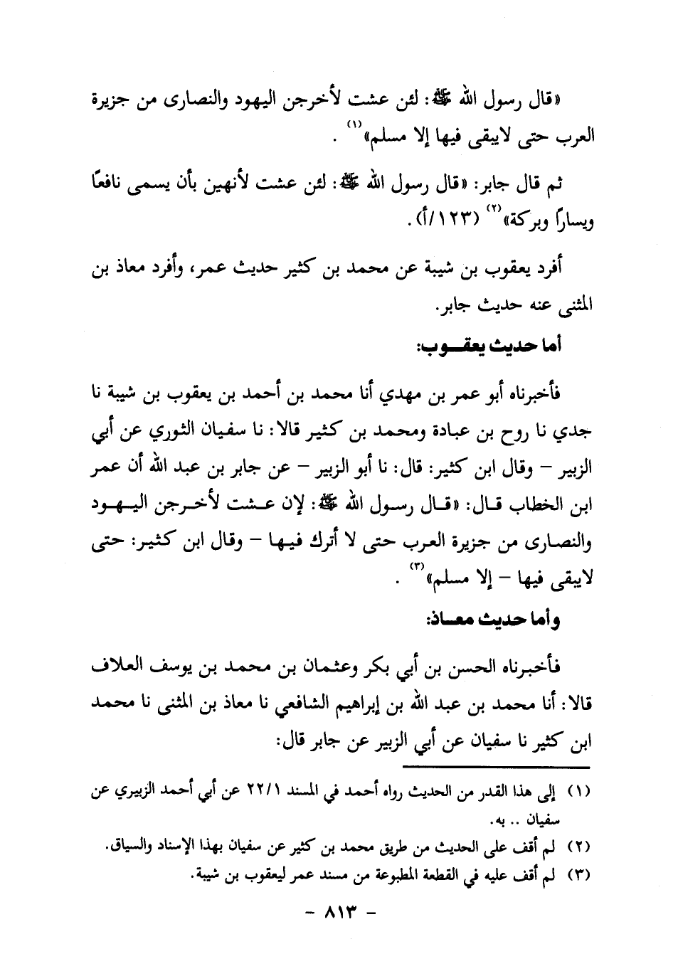 فأخبرناه أَبُو عُمَرَ بْنُ مَهْدِيٍّ، أنا مُحَمَّدُ بْنُ أَحْمَدَ بْنِ يَعْقُوبَ بْنِ شَيْبَةَ، نا جَدِّي، نا رَوْحُ بْنُ عُبَادَةَ وَمُحَمَّدُ بْنُ كَثِيرٍ قَالا: نا سُفْيَانُ الثَّوْرِيُّ عَنْ أَبِي الزُّبَيْرِ ـ وَقَالَ ابْنُ كَثِيرٍ: قَالَ: نا أَبُو الزُّبَيْرِ ـ عَنْ جَابِرِ بْنِ عَبْدِ اللَّهِ أَنَّ عُمَرَ بْنَ الْخَطَّابِ قَالَ: "قَالَ رَسُولُ اللَّهِ صَلَّى اللَّهُ عَلَيْهِ وَسَلَّمَ: لَئِنْ عِشْتُ لأُخْرِجَنَّ الْيَهُودَ وَالنَّصَارَى مِنْ جَزِيرَةِ الْعَرَبِ حَتَّى لا أَتْرُكَ فِيهَا ـ وَقَالَ ابْنُ كَثِيرٍ: حَتَّى لا يَبْقَى فِيهَا ـ إِلا مُسْلِمٌ" 3.