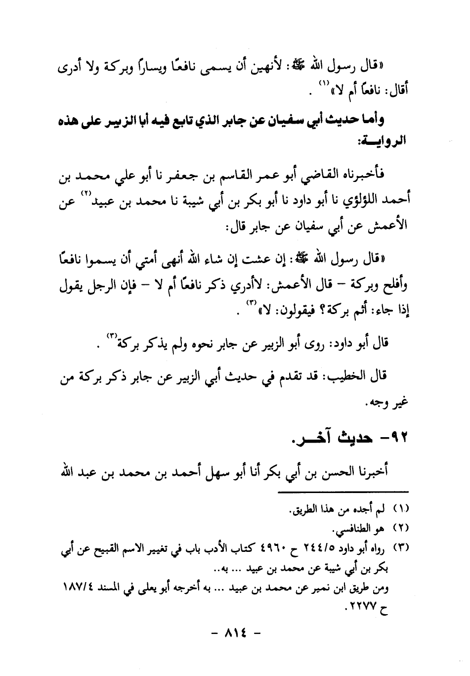 "قَالَ رَسُولُ اللَّهِ صَلَّى اللَّهُ عَلَيْهِ وَسَلَّمَ: لأَنْهَيَنَّ أَنْ يُسَمَّى نافعاً ويساراً وبركة، ولا أدري أقال: نَافِعًا أَمْ لا" 1.
