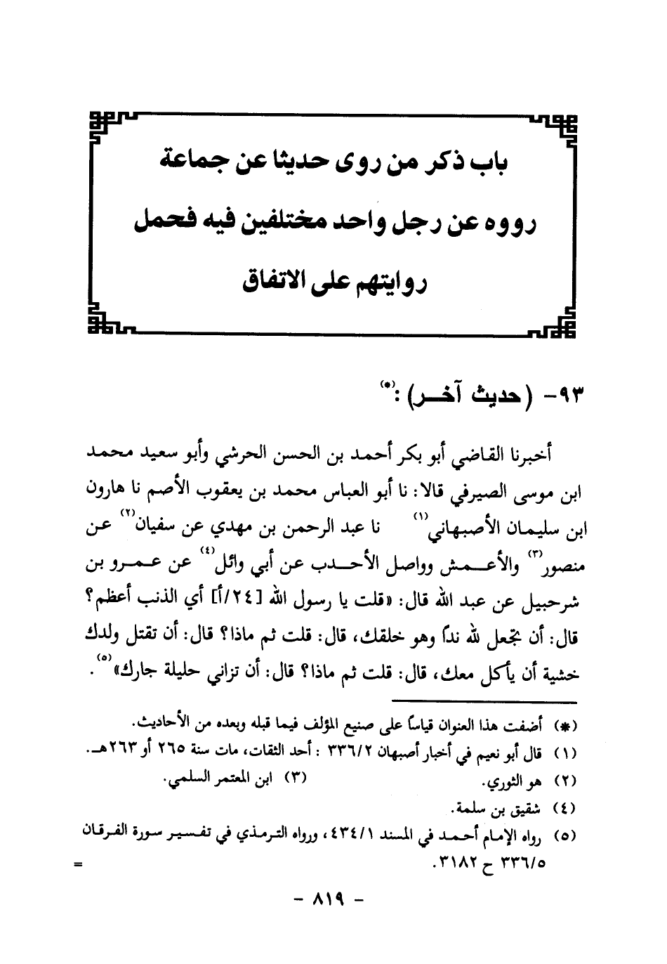 ابن يَعْقُوبَ الأَصَمُّ، نا هَارُونُ بْنُ سُلَيْمَانَ الأَصْبَهَانِيُّ2، نا عَبْدُ الرَّحْمَنِ بن مهدي عن سفيان3، عن مَنْصُورٍ4 وَالأَعْمَشِ، وَوَاصِلٍ الأَحْدَبِ، عَنْ أَبِي وَائِلٍ5، عَنْ عَمْرِو بْنِ شُرَحْبِيلَ، عَنْ عَبْدِ اللَّهِ قَالَ: "قلت: يا رسول الله (124/ أ)