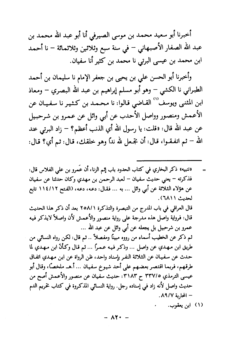 وَأَخْبَرَنَا أَبُو الْحَسَنِ عَلِيُّ بْنُ يَحْيَى بْنِ جَعْفَرٍ الإِمَامُ، نا سُلَيْمَانُ بْنُ أَحْمَدَ الطَّبَرَانِيُّ، نا الْكَشِّيُّ ـ وَهُوَ أَبُو مُسْلِمٍ إِبْرَاهِيمُ ابن عَبْدِ اللَّهِ الْبَصْرِيُّ ـ وَمُعَاذُ بْنُ الْمُثَنَّى، وَيُوسُفُ1 الْقَاضِي قَالُوا: نا محمد بن كثير، نا سفيان عَنِ الأَعْمَشِ وَمَنْصُورٍ وَوَاصِلٍ الأَحْدَبِ، عَنْ أَبِي وَائِلٍ، عَنْ عَمْرِو بن شرحبيل، عن عبد الله قَالَ: "قُلْتُ: يَا رَسُولَ اللَّهِ، أَيُّ الذَّنْبِ أَعْظَمُ؟ ـ زَادَ الْبِرْتِيُّ: عِنْدَ اللَّهِ ـ ثُمَّ اتَّفَقُوا، قَالَ: أَنْ تَجْعَلَ لِلَّهِ نِدًّا وَهُوَ خَلَقَكَ، قَالَ: ثُمَّ أَيٌّ؟ قَالَ: