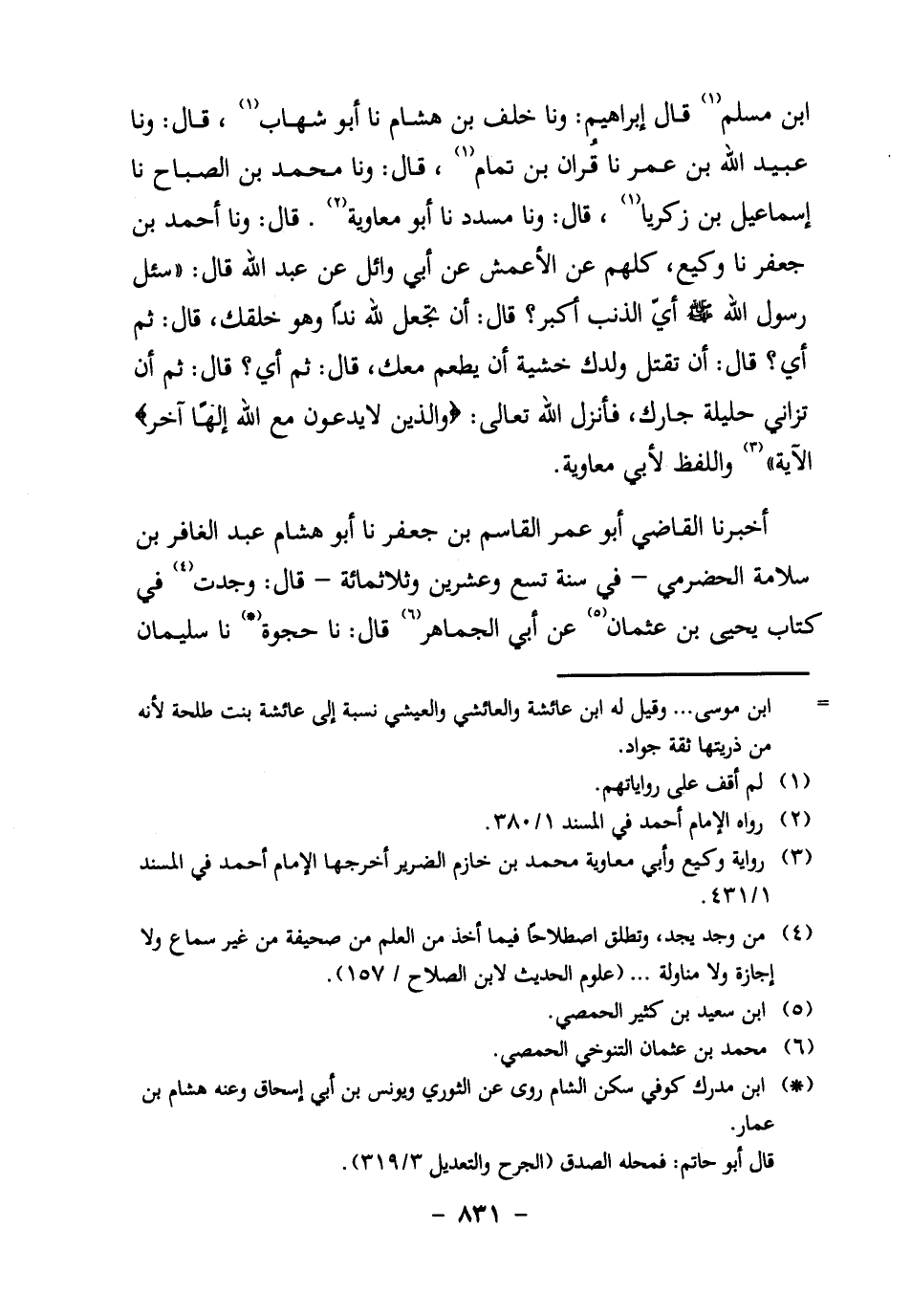 ونا مُحَمَّدُ بْنُ الصَّبَّاحِ، نا إِسْمَاعِيلُ بْنُ زَكَرِيَّا3، قَالَ: وَنا مُسَدَّدٌ، نا أَبُو مُعَاوِيَةَ2. قَالَ: وَنا أَحْمَدُ بْنُ جَعْفَرٍ، نا وَكِيعٌ، كُلُّهُمْ عَنِ الأَعْمَشِ، عَنْ أَبِي وَائِلٍ، عَنْ عَبْدِ اللَّهِ قَالَ: "سُئِلَ رسول الله صَلَّى اللَّهُ عَلَيْهِ وَسَلَّمَ؛ أَيُّ الذَّنْبِ أَكْبَرُ؟ قَالَ:
