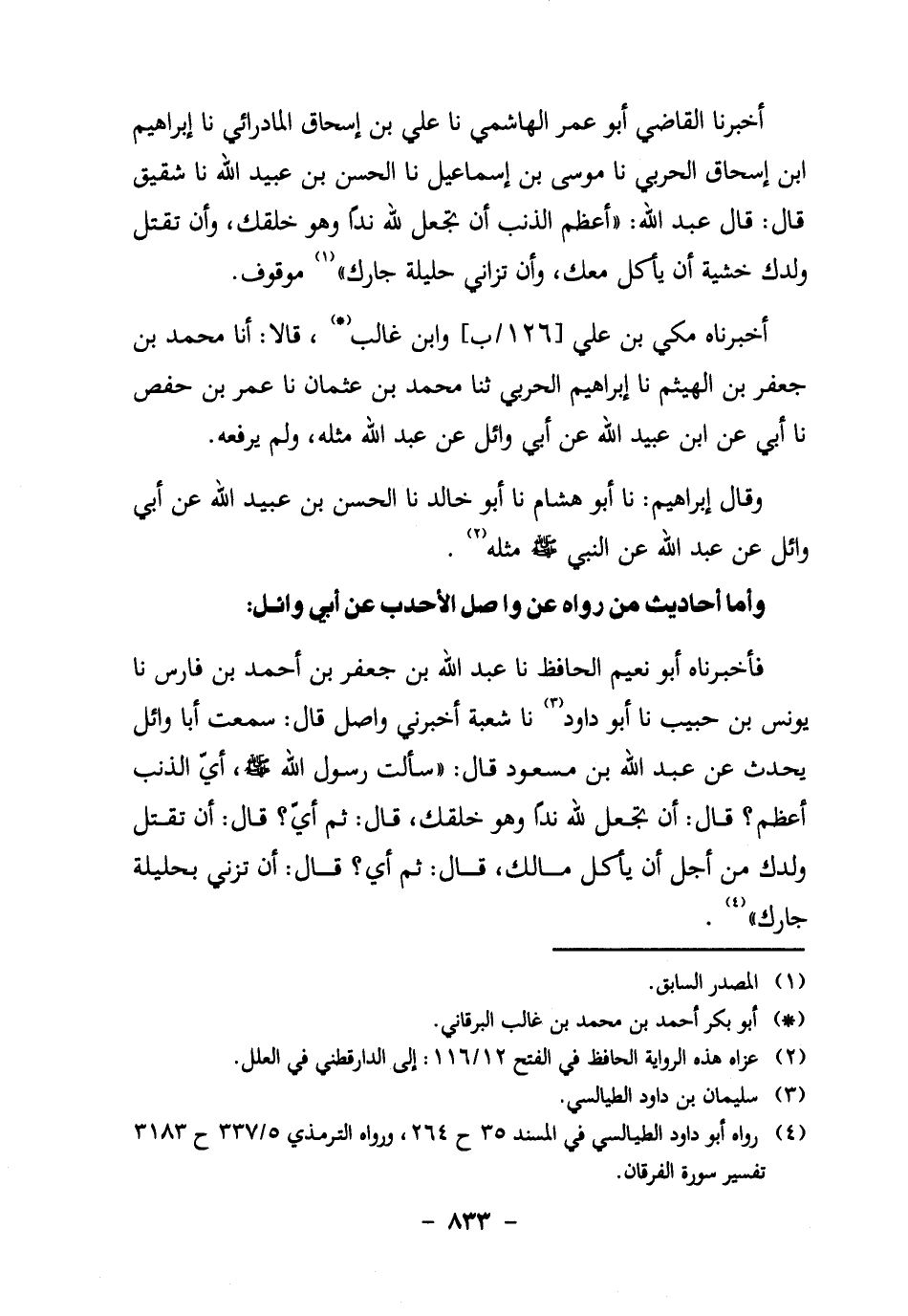 فَأَخْبَرَنَاهُ أَبُو نُعَيْمٍ الْحَافِظُ، نَا عبد الله بن جعفر بن أَحْمَدَ بْنِ فَارِسٍ، نا يُونُسُ بْنُ حَبِيبٍ، نا أَبُو دَاوُدَ4، نا شُعْبَةُ، أَخْبَرَنِي وَاصِلٌ قَالَ: سَمِعْتُ أَبَا وَائِلٍ يُحَدِّثُ عَنْ عبد الله بن مسعود قال: "سَأَلْتُ رَسُولَ اللَّهِ صَلَّى اللَّهُ عَلَيْهِ وَسَلَّمَ؛ أَيُّ الذَّنْبِ أَعْظَمُ؟ قَالَ: أَنْ تَجْعَلَ لِلَّهِ نِدًّا وَهُوَ خَلَقَكَ، قَالَ: ثُمَّ أَيٌّ" قَالَ: أَنْ تَقْتُلَ وَلَدَكَ مِنْ أجل أن يأكل مالك، قَالَ: ثُمَّ أَيٌّ؟ قَالَ: أَنْ تزني بحليلة جارك" 5.